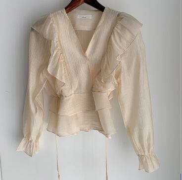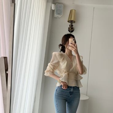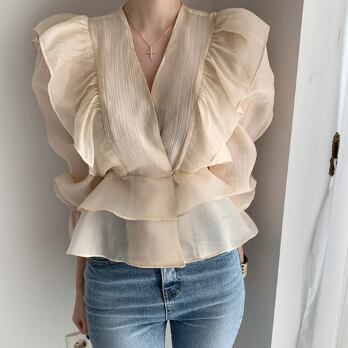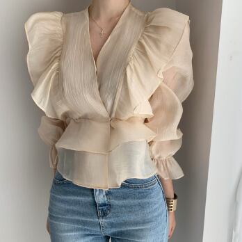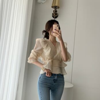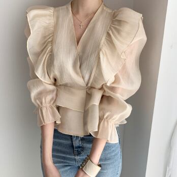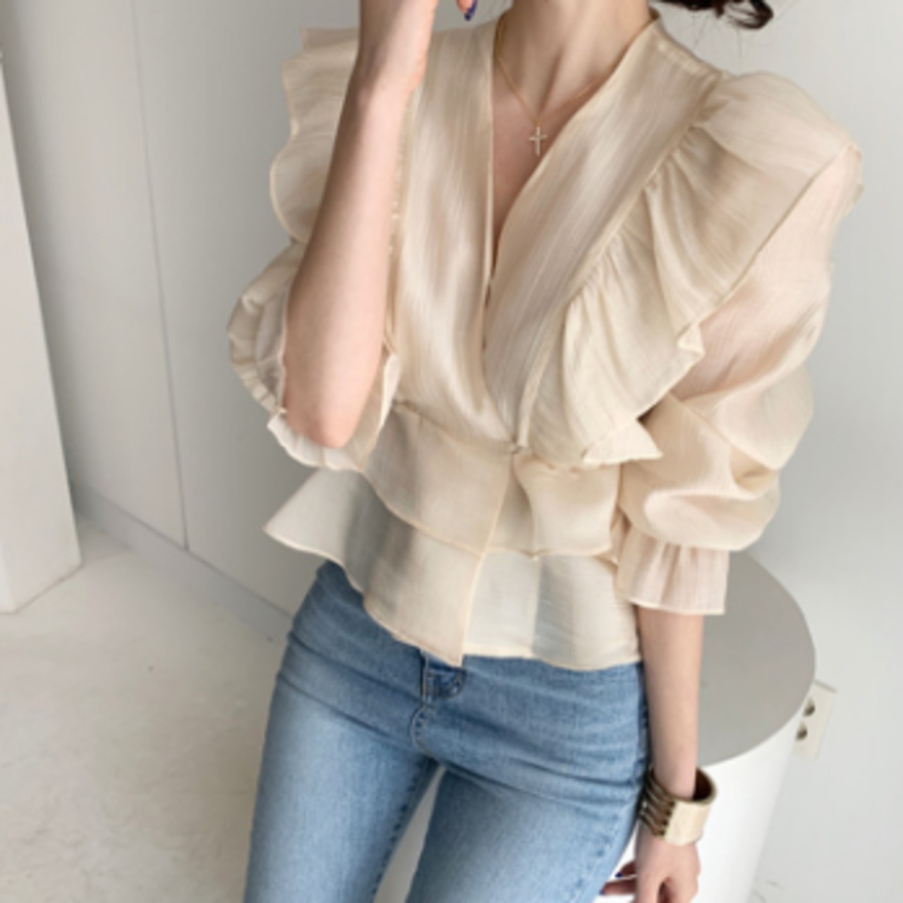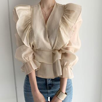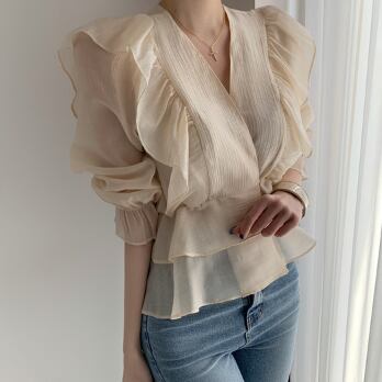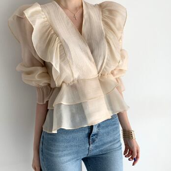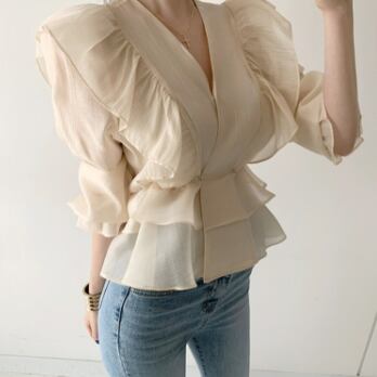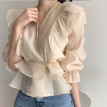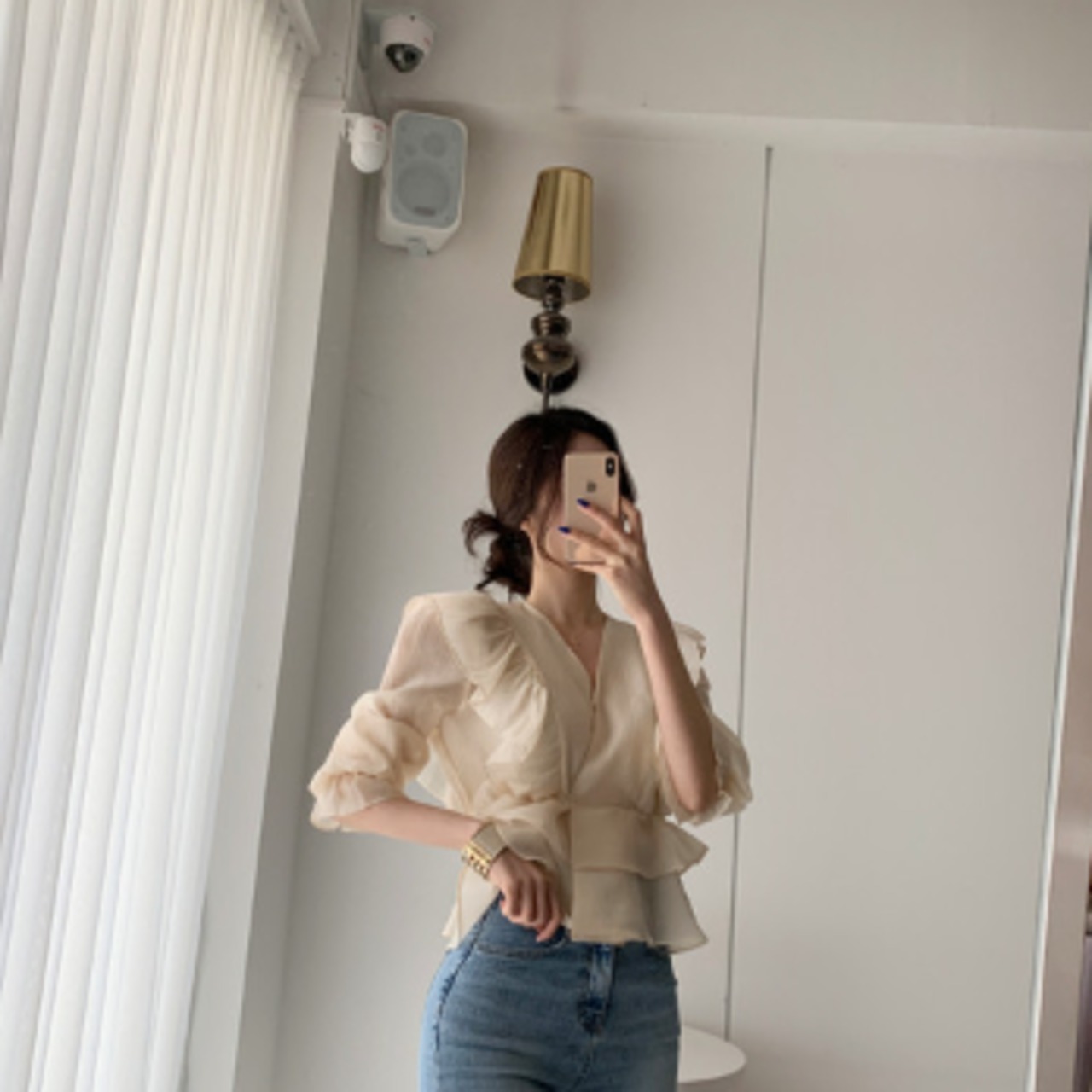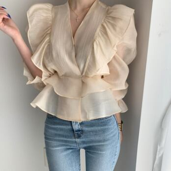 Vネックシフォンシャツ トップス ブラウス フェミニン アプリコット ショート丈 袖あり 半袖 Vネック スリム 細身 タイト フリル 透け感 シースルー 大人女子 大人 上品 おしゃれ きれいめ シンプル エレガント レトロ レトロ風 こなれ感 ラフ 個性的 デザイン 主役級 存在感 無地 ライン 春 スプリング 20代 30代 40代 レディース 女性用 オフィス ビジネス OL デート お出かけ 女子会 着回し 普段使い トレンド ファッション コーデ S M L