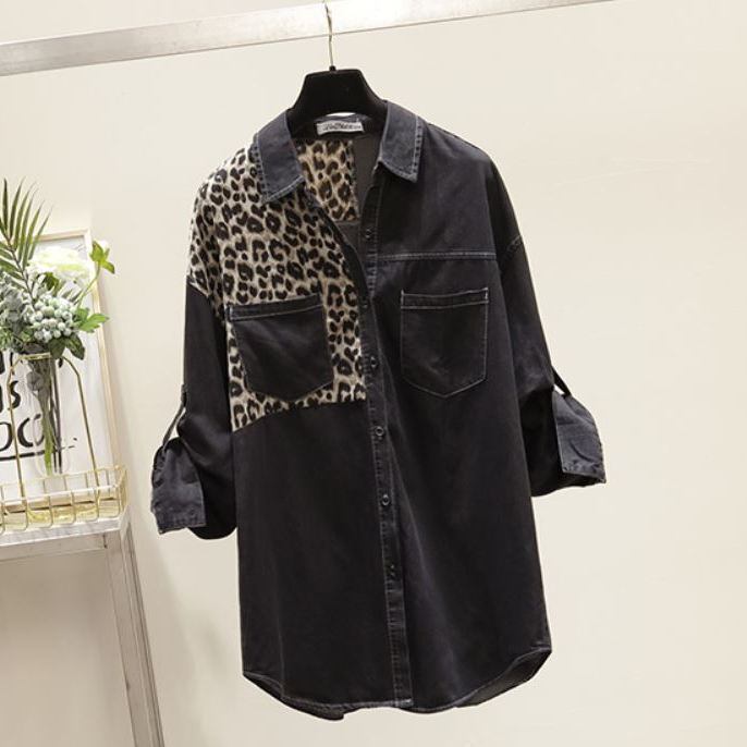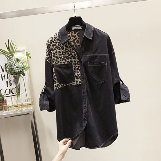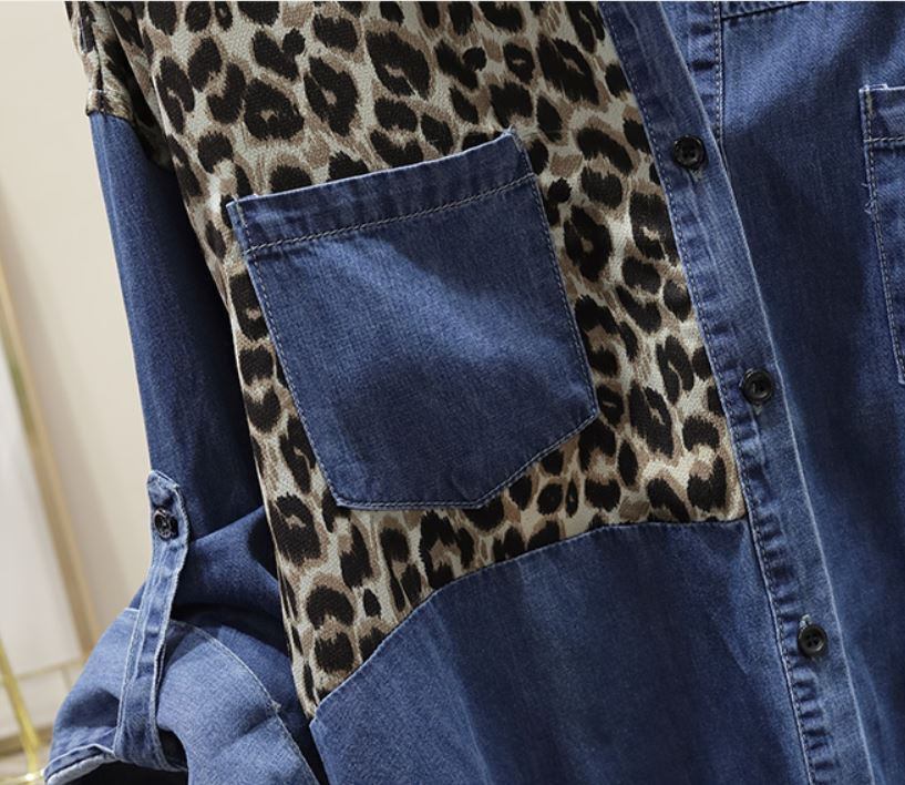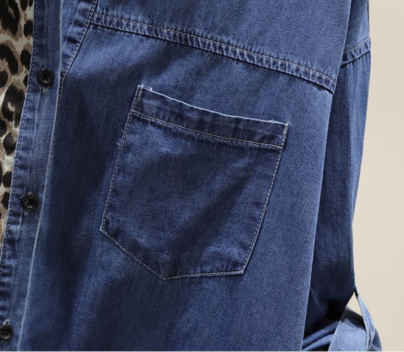 デニム シャツ オーバーサイズ レオパード柄切り替え 袖ロールアップベルト付き トップス シャツ ブラウス ミディアム丈 七分袖 長袖 ドロップショルダー 襟付き 切り替えデザイン ブルーデニム カラーデニム シンプル カジュアル おしゃれ かっこいい 大人女子 こなれ感 個性的 クール 存在感 無地 ヒョウ柄 春 夏 秋 冬 オールシーズン レディース ママ 学生 通学 お出かけ 女子会 普段使い 重ね着 韓国系 スタイル 楽ちん 体系カバー フリーサイズ 大きめ サイズ ブラック ブルー