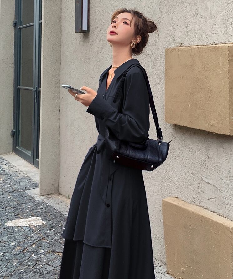 カシュクール調の斜めボタンデザインがアシンメトリーなラップ風シャツワンピースが登場しました。程よいミモレ丈で膝下からのロングシルエットが女っぽく、きちんと感も出せる1枚。袖は長めで襟付きのデザインも素敵です。