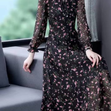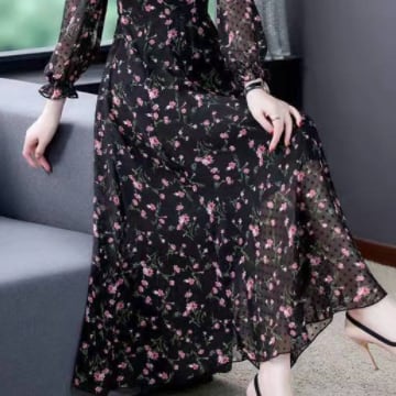 「大人かわいい」を目指すあなたにおすすめの花柄ワンピースです。モノトーンのブラックカラーで、周りと差をつけたい方にぴったり。ロング丈で、スリムなシルエットなので、スタイルアップも叶います。