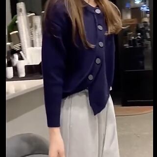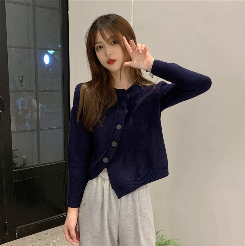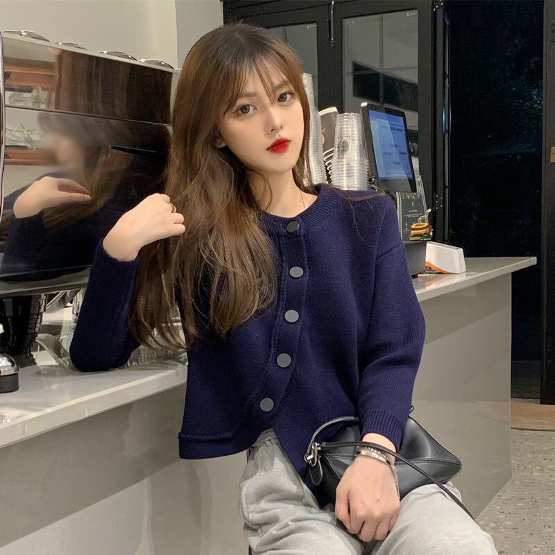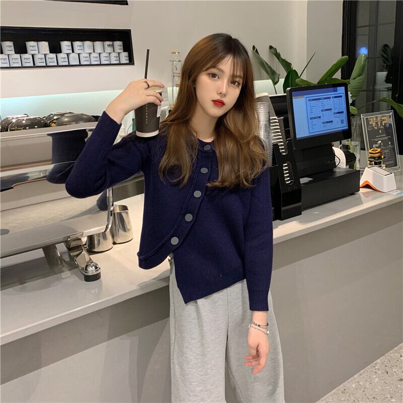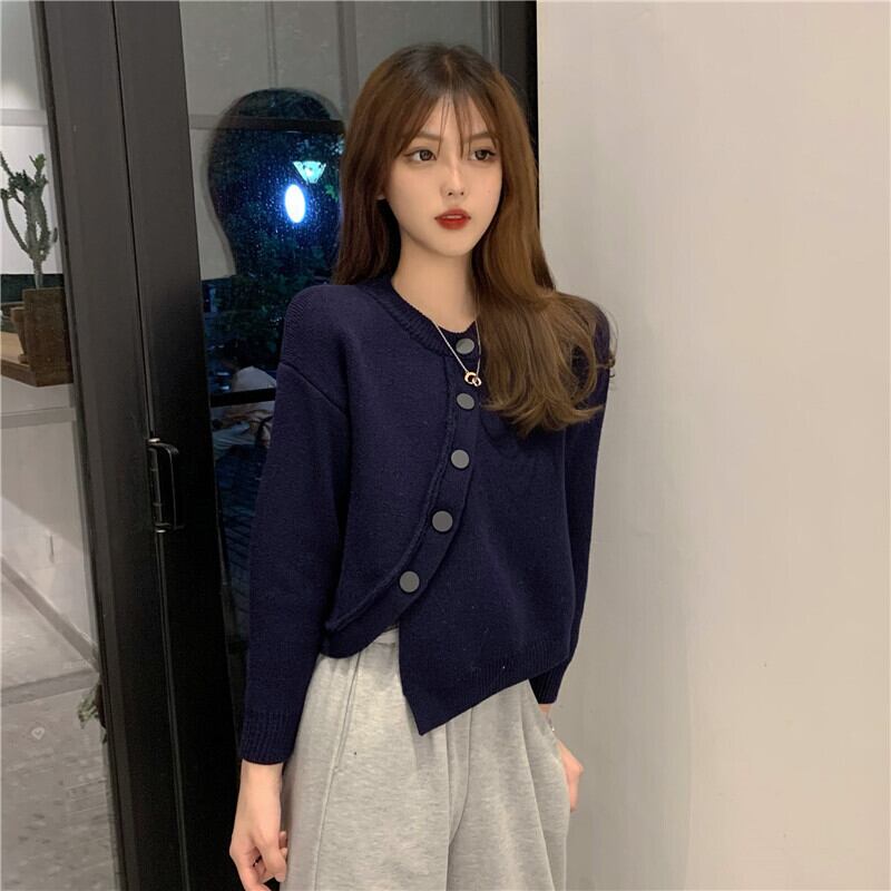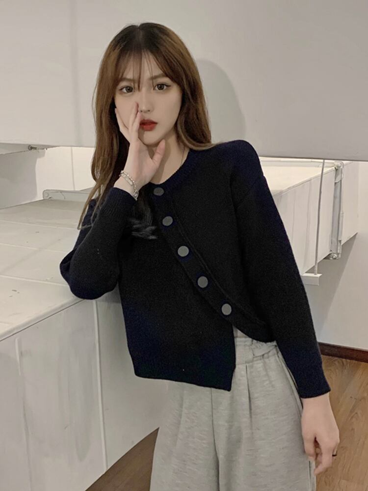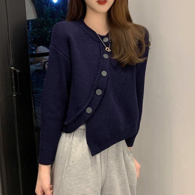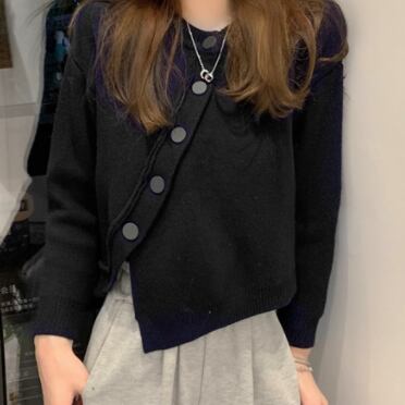オーバーサイズ ななめボタン アンバランスヘム アシンメトリー クロップド トップス セーター カーディガン プルオーバー ショート丈 袖あり 長袖 ドロップショルダー クルーネック 前開き ニット 大人可愛い シンプル カジュアル 大人 上品 おしゃれ こなれ感 個性的 無地 秋 冬 春 レディース 女性用 ママ 女の子 学生 通学 デート お出かけ 女子会 休日 着回し 普段使い 重ね着 韓国系 オルチャン ファッション コーデ 楽ちん S M L ゆったり サイズ ブラック ダークブルー