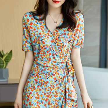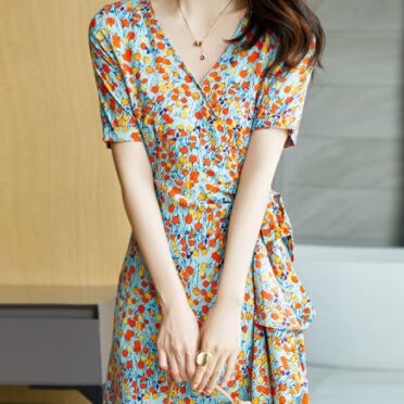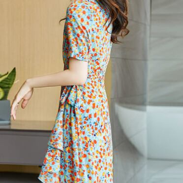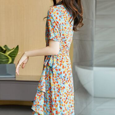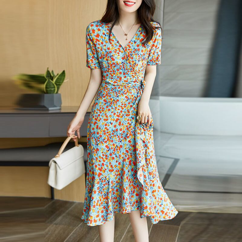 サマーワンピース ミディアム丈 袖あり 半袖 Vネック スリム 細身 タイト フィッシュテール フリル リボン 大人女子 大人 上品 おしゃれ デイリーウェア エレガント レトロ レトロ風 こなれ感 ラフ 個性的 デザイン 主役級 存在感 柄 花柄 フラワー ドット柄 水玉 夏 サマー 20代 30代 40代 レディース 女性用 デート お出かけ 女子会 着回し 普段使い 美脚 足長 M L XL 大きいサイズ 2XL 3XL 4XL マルチカラー 多色