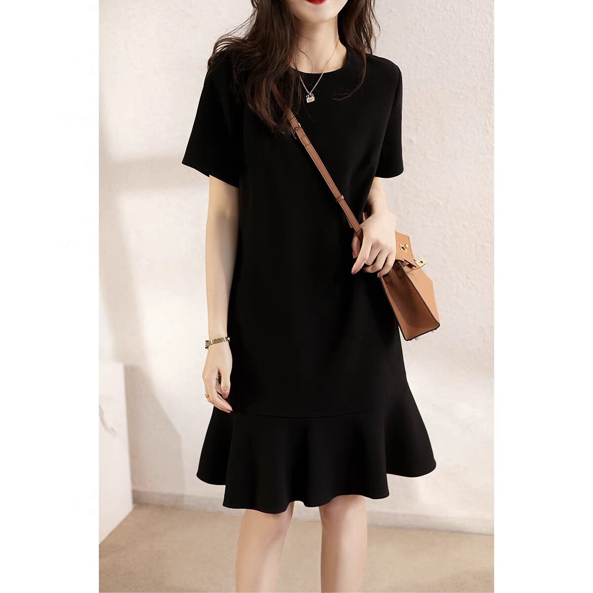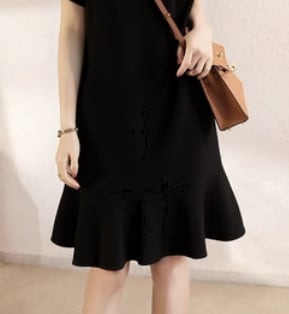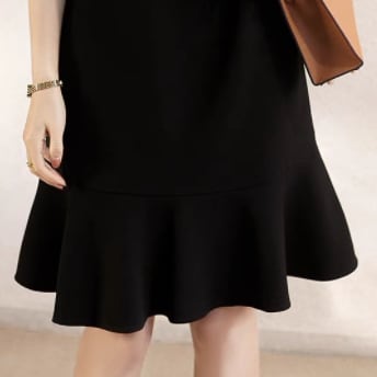 ブラックのAライン膝丈ワンピースは、シンプルで洗練されたデザインが特徴。キュートなフレアとフリルが女性らしさを演出し、ラウンドネックで大人っぽい雰囲気も醸し出します。春夏秋の季節に、入園式や入学式、卒園式、卒業式、結婚式などのフォーマルな場面にもおすすめです。また、普段使いにもぴったりで、デートや女子会、休日のお出かけにも着回せる頼れる一枚です。