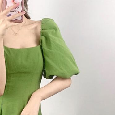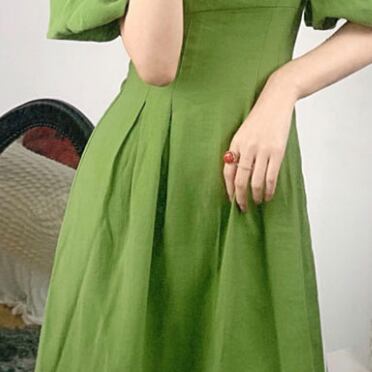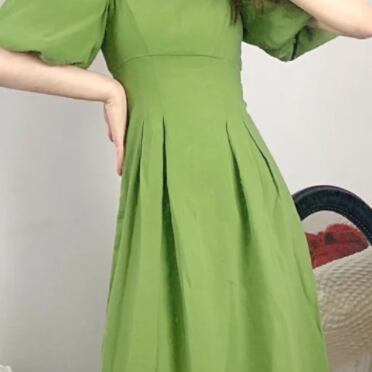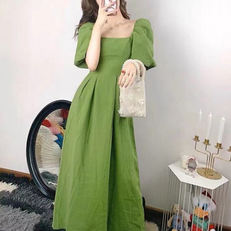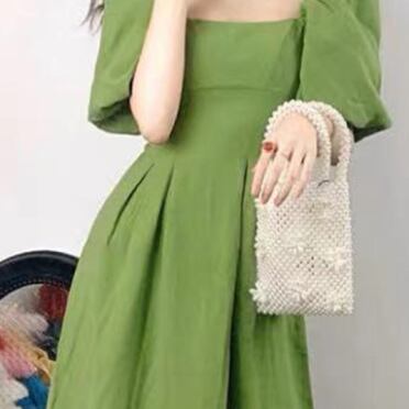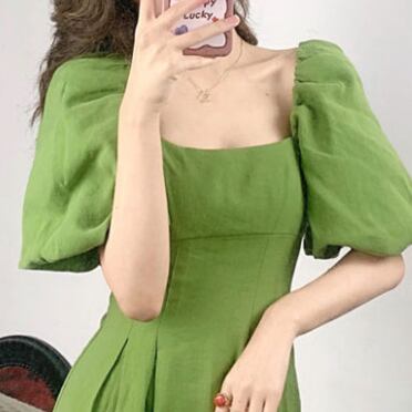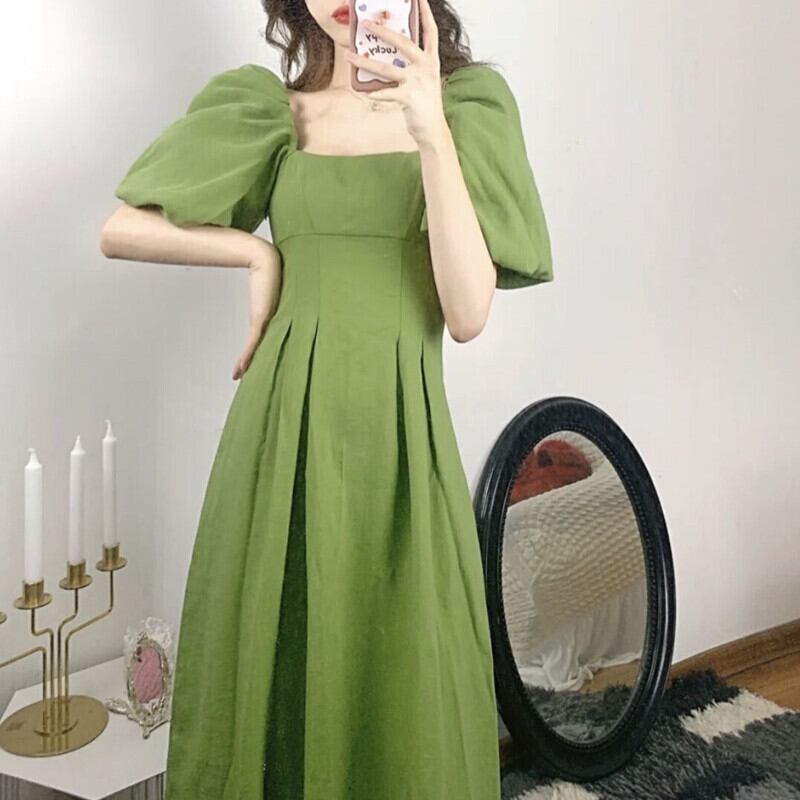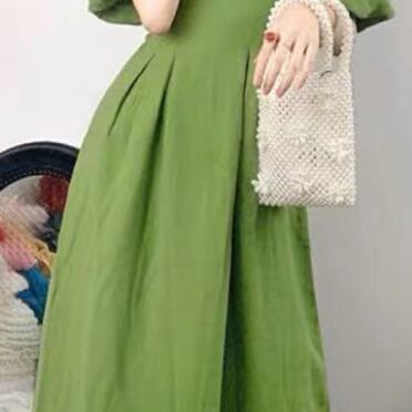 サマーワンピース シンプル グリーン 緑 ミディアム丈 袖あり 半袖 スクエアネック フレア Aライン 大人女子 大人 上品 おしゃれ きれいめ シンプル エレガント デイリーウェア レトロ レトロ風 こなれ感 主役級 存在感 無地 夏 サマー 20代 30代 レディース 女性用 デート お出かけ 女子会 食事会 イベント リゾート 旅行 着回し 普段使い トレンド ファッション コーデ 定番 細見え スタイル M L XL 大きいサイズ 2XL 3XL 4XL
