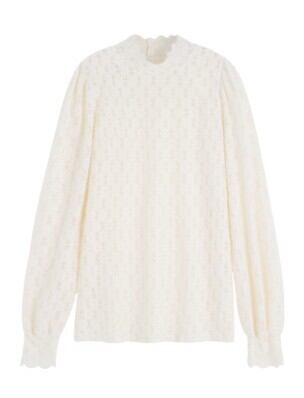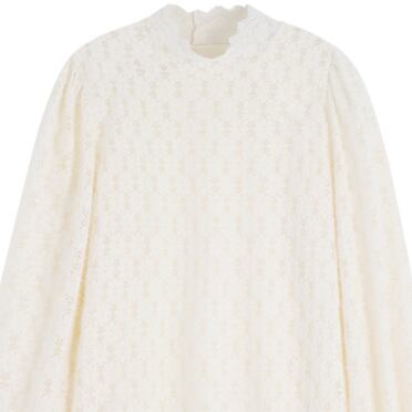 このブラウスは、優しく透け感のある素材が、女性の美しさを引き立てます。ハイネックもまた女性らしい印象を与え、首元のシルエットも美しく見せてくれます。