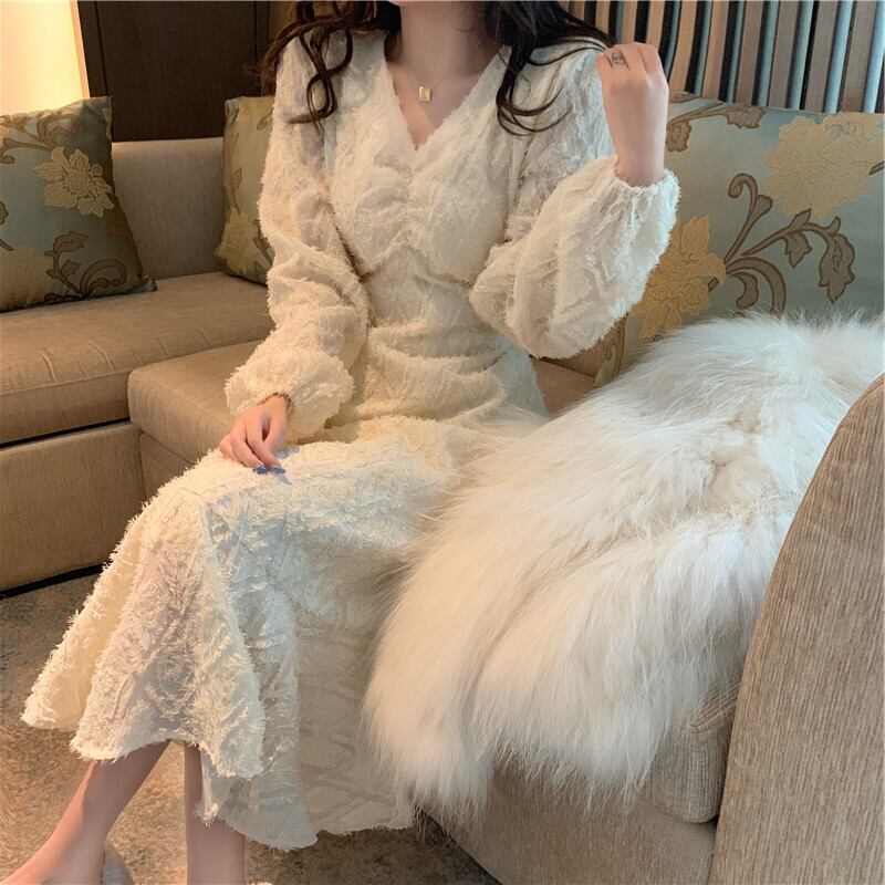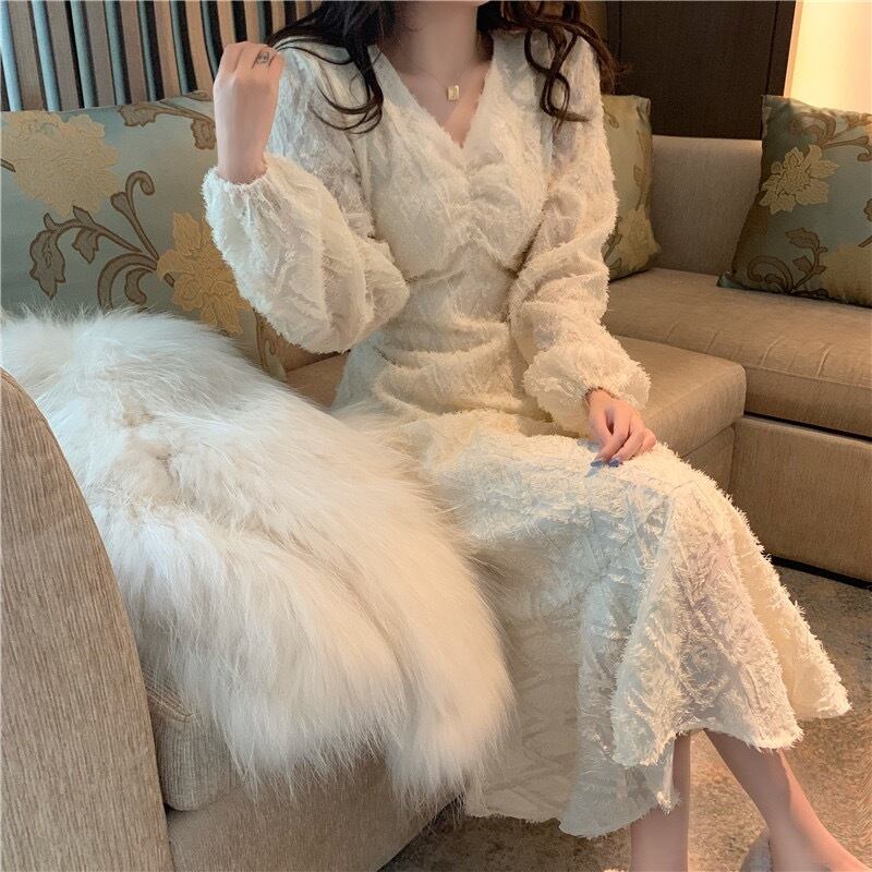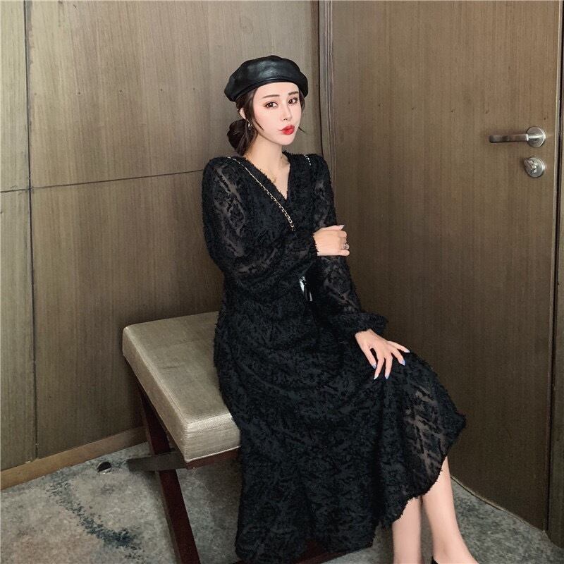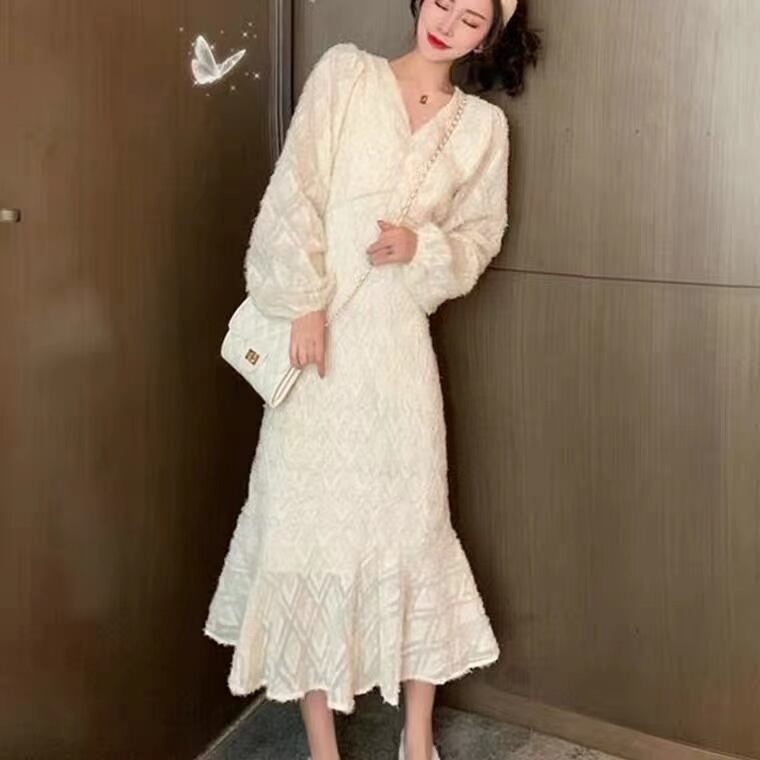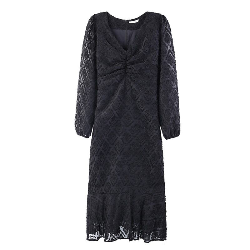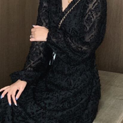 ロングワンピース スイート ブラック 黒 アプリコット ミディアム丈 袖あり 長袖 ランタンスリーブ Vネック フィッシュテール フリル 透け感 シアー レース 大人女子 大人 上品 おしゃれ エレガント レトロ レトロ風 こなれ感 キュート かわいい 女子 個性的 デザイン 主役級 存在感 無地 秋 冬 20代 30代 40代 レディース 女性用 デート お出かけ 女子会 食事会 イベント リゾート 旅行 パーティ M L XL 大きいサイズ 2XL 3XL 4XL