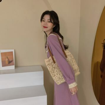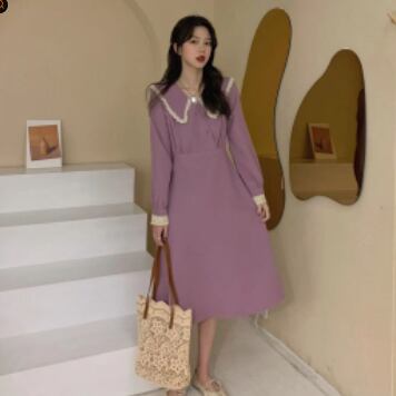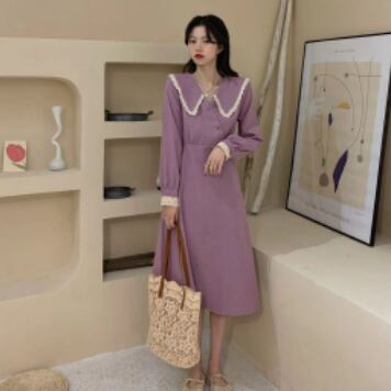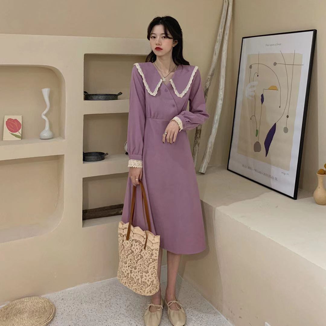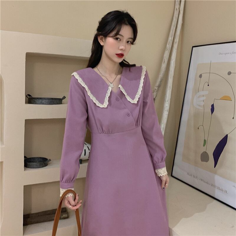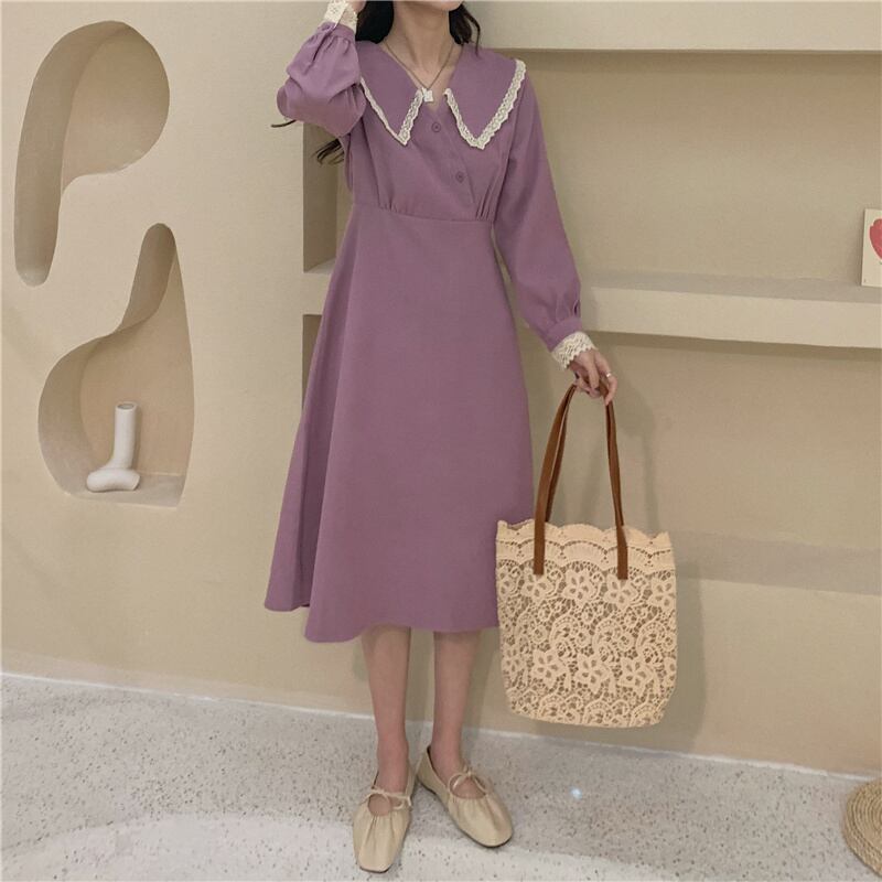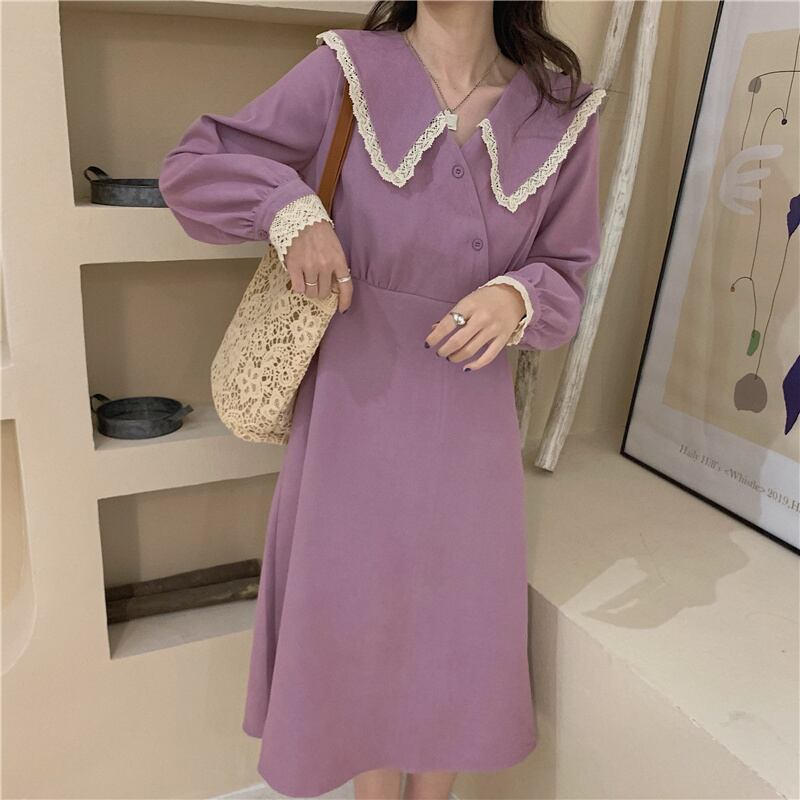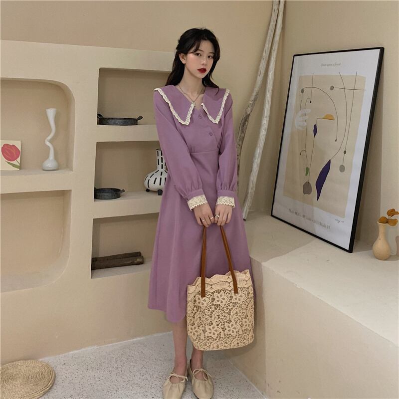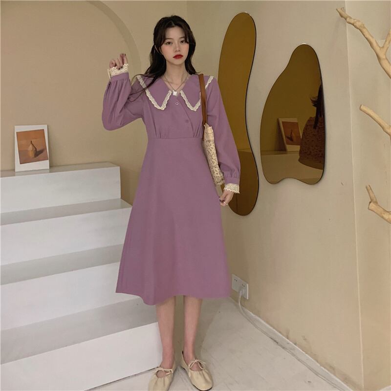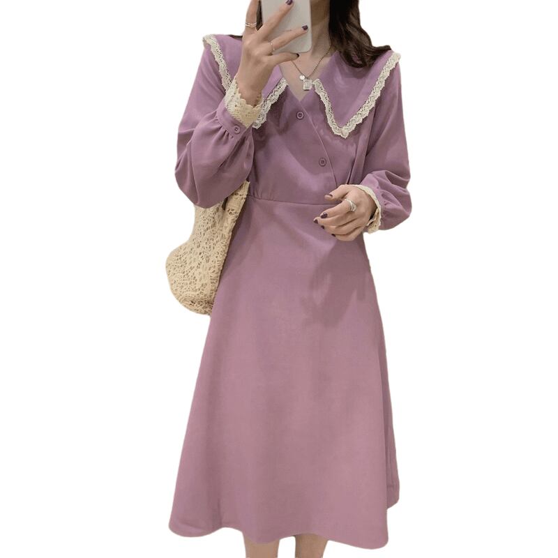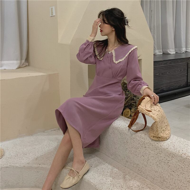 ビッグカラーワンピース スイート ガーリー パープル 紫 ミドル丈 袖あり 長袖 襟付き スリム 細身 タイト ボタン フリル レース 大人女子 大人 上品 おしゃれ きれいめ シンプル エレガント デイリーウェア レトロ レトロ風 こなれ感 キュート かわいい 女子 個性的 デザイン 主役級 存在感 無地 春 スプリング 20代 10代 30代 レディース 女性用 オフィス ビジネス OL 通勤 学生 学校 通学 M L XL 大きいサイズ 2XL 3XL 4XL