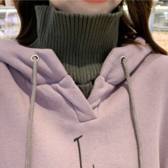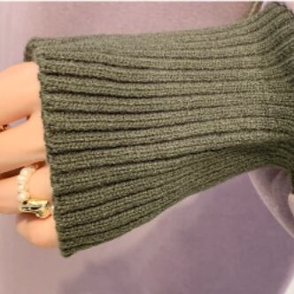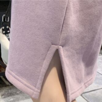 トレーナー生地のワンピースに異素材のハイネックと袖口をドッキングさせた