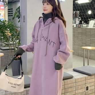 商品名: ドッキングワンピース パーカー トレーナーワンピース ミディアム丈 袖あり リブ袖 ハイネック ワイド ドッキング フード付き ニット 厚手 異素材MIX