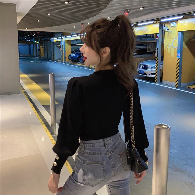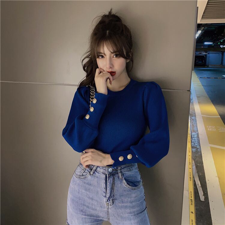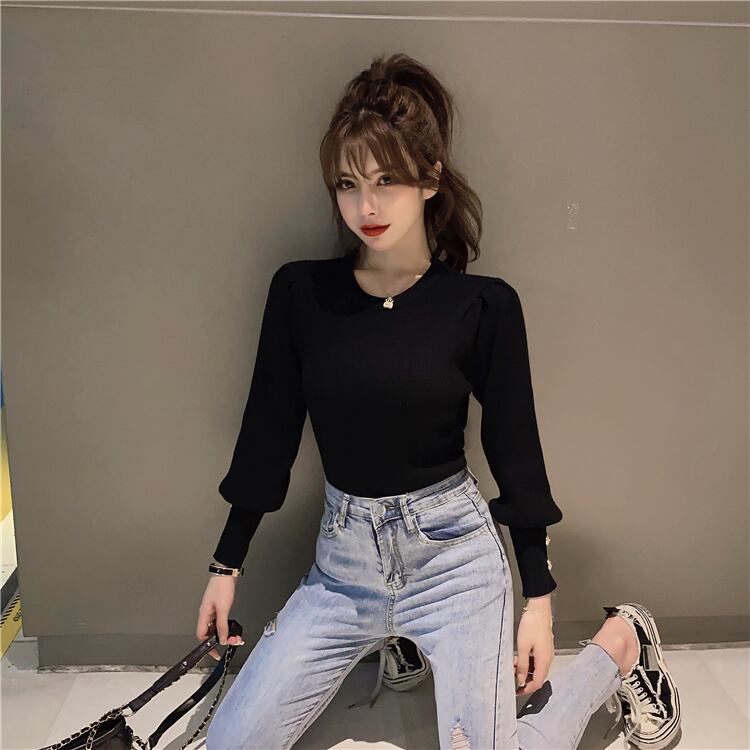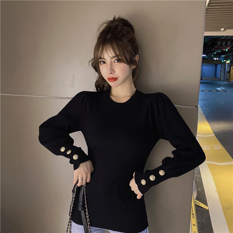 飾りボタンポイント ロングカフス すっきり トップス ニットソー セーター ミディアム丈 長袖 ボリューム袖 パフスリーブ クルーネック スリム タイト 細身 リブニット 伸縮性 かわいい 大人可愛い きれいめ シンプル カジュアル 大人 上品 おしゃれ お洒落 大人女子 エレガント 無地 春 秋 レディース 女性用 ママ 女の子 OL 通勤 学生 通学 デート お出かけ 公園デビュー 女子会 休日 着回し 普段使い 重ね着 韓国系 オルチャン コーデ スタイル S M L ブラック ブルー