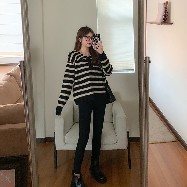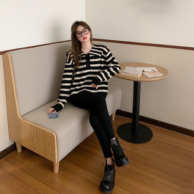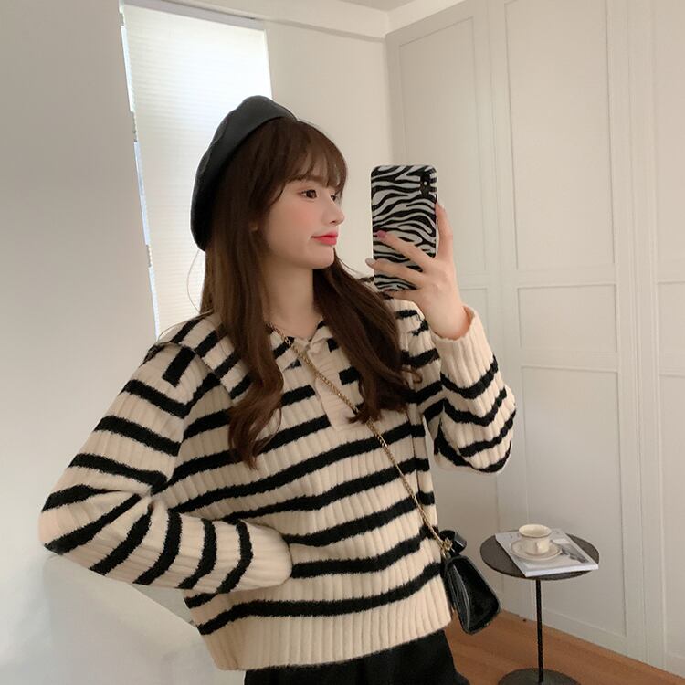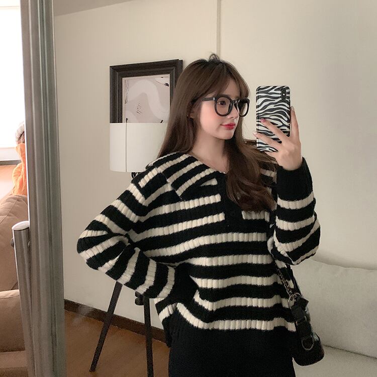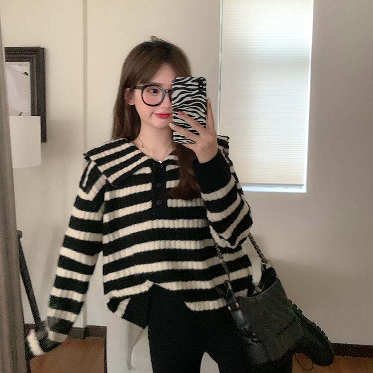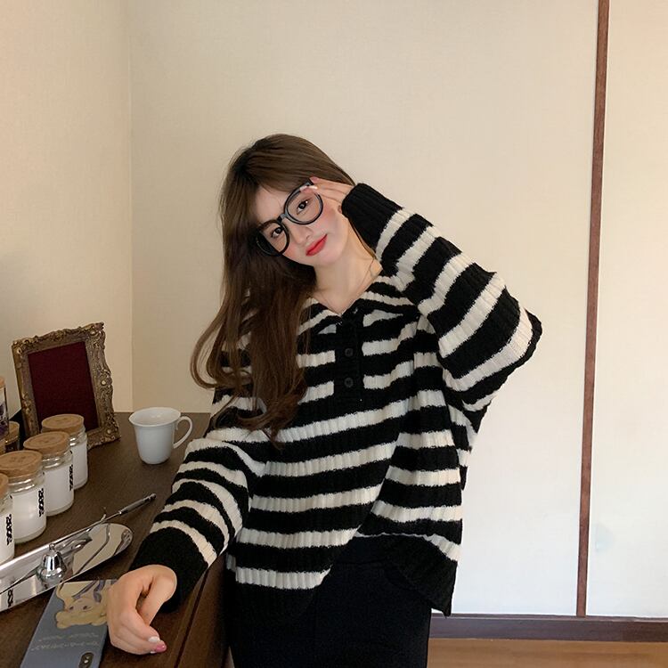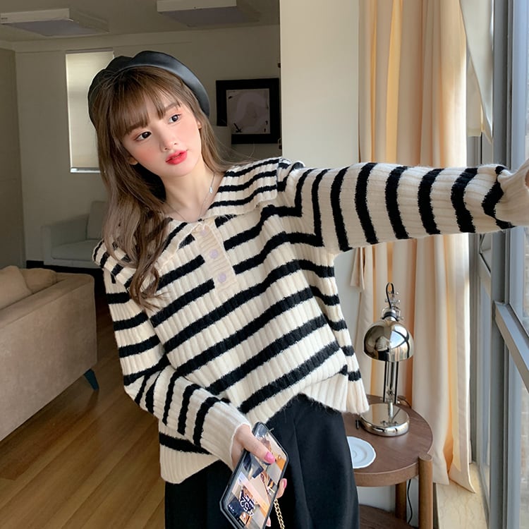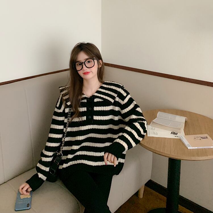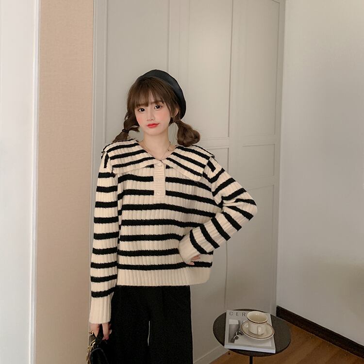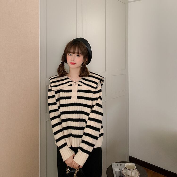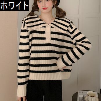 オーバーサイズ ビックカラー 大きめ襟 トップス ニットソー セーター ミディアム丈 長袖 ドロップショルダー 萌袖 襟付き ニット かわいい 大人可愛い シンプル カジュアル 大人 上品 おしゃれ お洒落 レトロ 大人女子 キュート ボーダー シマ 春 秋 レディース 女性用 ママ 女の子 学生 通学 お出かけ 公園デビュー 女子会 休日 普段使い 韓国系 オルチャン ファッション スタイル 楽ちん 体系カバー トレンド S M L XL 大きめ ゆったり ゆる サイズ ブラック ホワイト