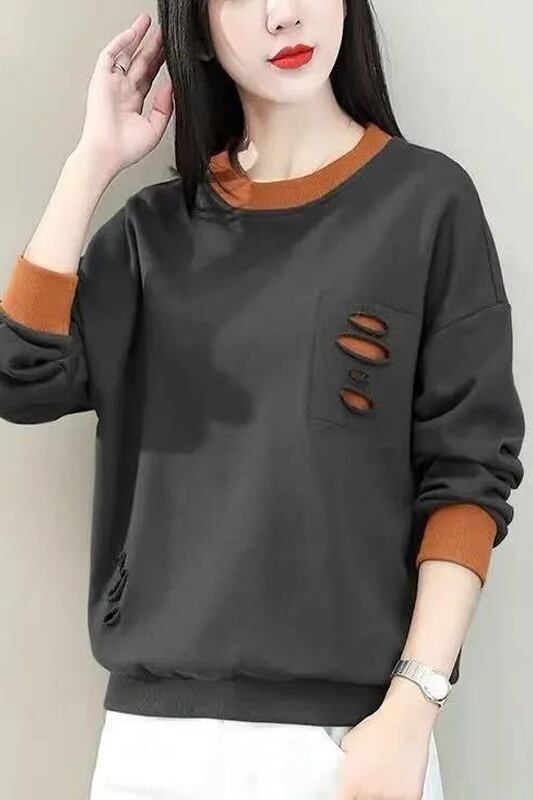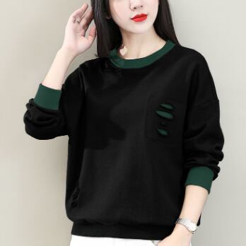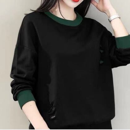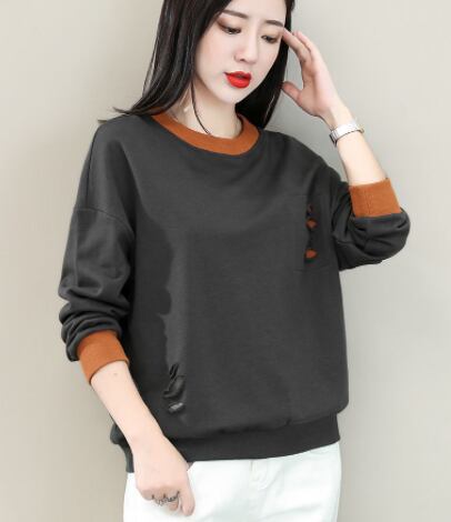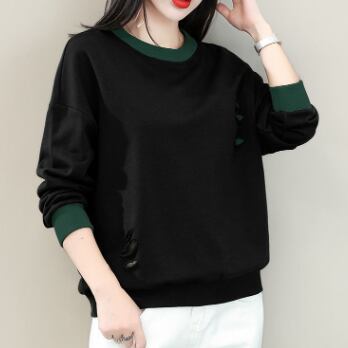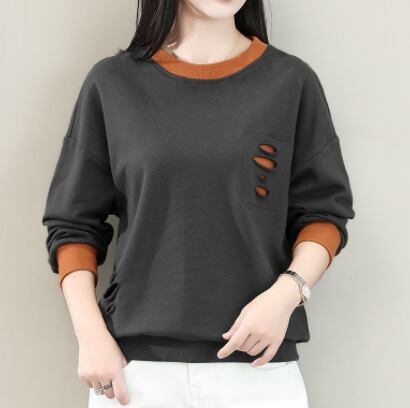ダメージプルオーバー トップス トレーナー カジュアル ブラック 黒 グレー 灰色 レギュラー丈 袖あり 長袖 ラウンドネック ストレート 綿 コットン 大人女子 大人 上品 おしゃれ デイリーウェア レトロ レトロ風 こなれ感 個性的 デザイン 主役級 存在感 無地 配色 コントラストカラー 春 スプリング 秋 オータム 20代 30代 レディース 女性用 休日 おうち らくちん 着回し 普段使い M L XL 大きいサイズ 2XL 3XL バイカラー ツートーンカラー