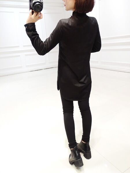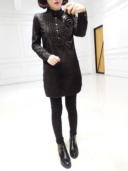 長袖、膝上丈のシャツワンピース。カジュアルからフォーマルまで着回し可能。