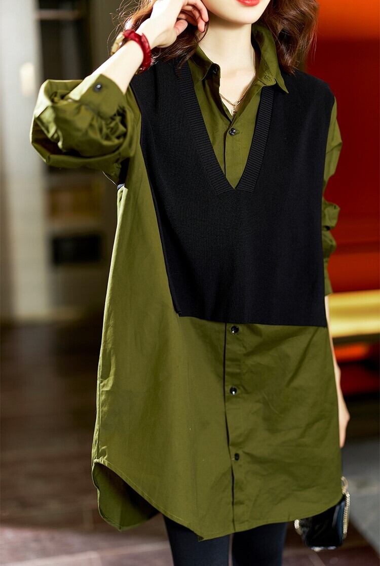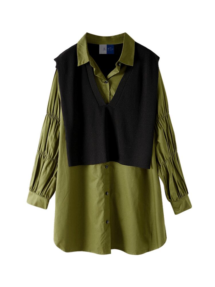 フェイク2ピースシャツ トップス シャツ ブラウス シンプル グリーン 緑 ミディアム丈 袖あり 長袖 襟付き ストレート フェイク2ピース 大人女子 大人 上品 おしゃれ デイリーウェア レトロ レトロ風 こなれ感 ルーズ シルエット ラフ 個性的 デザイン 主役級 存在感 無地 春 スプリング 20代 30代 40代 レディース 女性用 オフィス ビジネス OL 通勤 学生 学校 通学 着回し 普段使い 重ね着 レイヤード ファッション コーデ S M L XL
