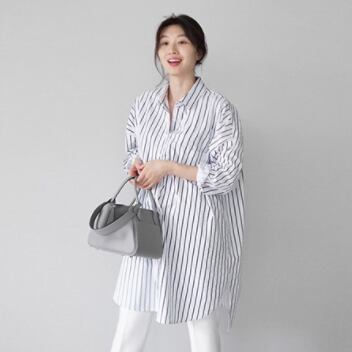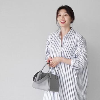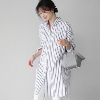 襟付きの長袖シャツワンピース。前開きで着脱もラクラク。無地とストライプの2種類から選べ、どちらもきれいめで大人可愛い雰囲気が漂います。シンプルなデザインだから、アクセサリーやバッグでコーディネートのアクセントを加えるのもおすすめです。着る人それぞれのスタイルや体型に合うよう、身幅や袖口もゆったりめに設定しました。