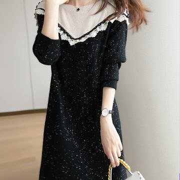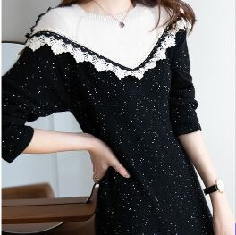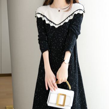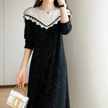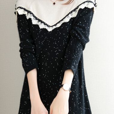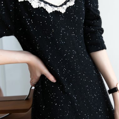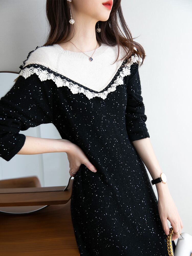 V字切替え 配色ヨーク レーストリミング スパンコール付き キラキラ ニットワンピ ワンピース ひざ丈 膝上 ミディアム丈 長袖 ラウンドネック Aライン 切り替えデザイン レース ニット かわいい 大人可愛い きれいめ シンプル 大人 上品 おしゃれ お洒落 大人女子 エレガント 存在感 無地 秋 冬 レディース ママ 女の子 学生 通学 デート お出かけ 女子会 休日 レストラン 韓国系 オルチャン ファッション コーデ スタイル 楽ちん モテ 体系カバー M L 黒 ブラック バイカラー