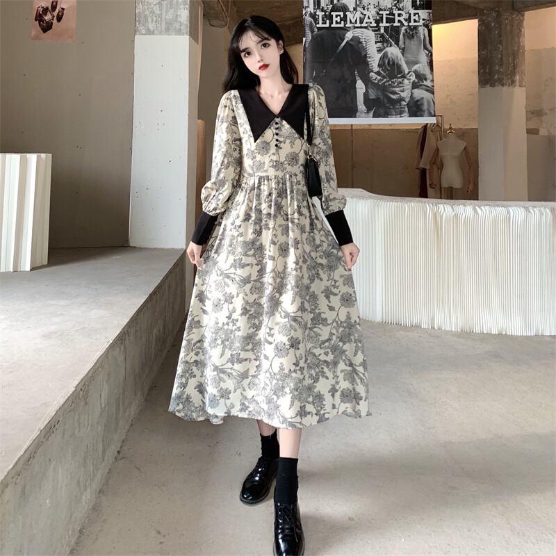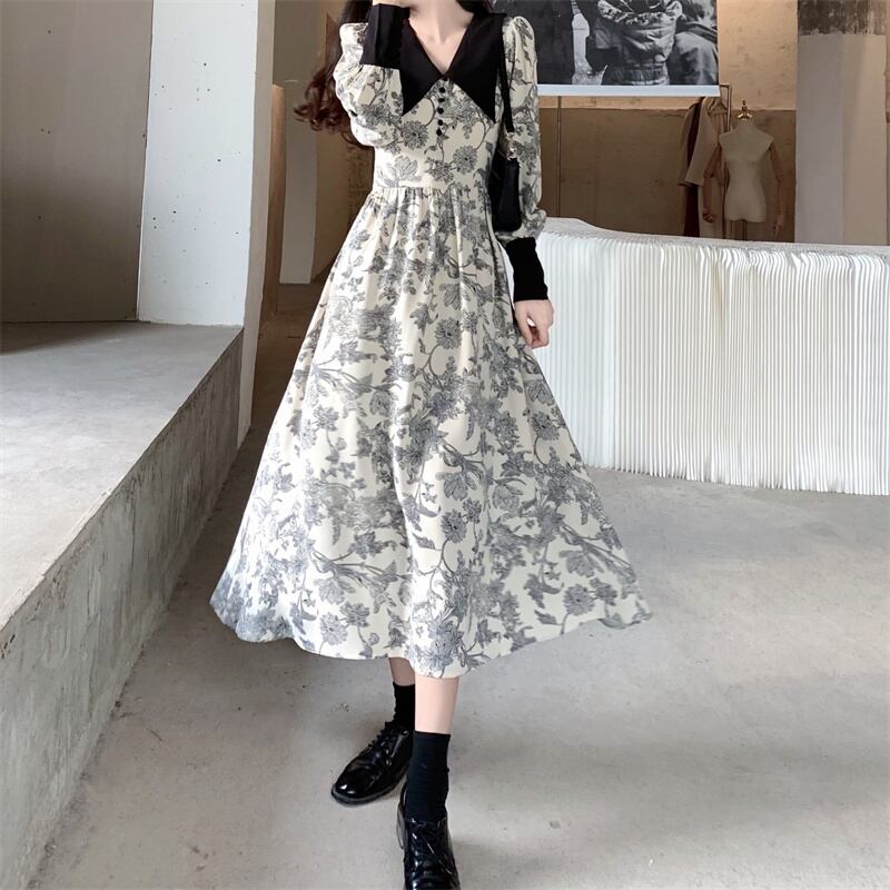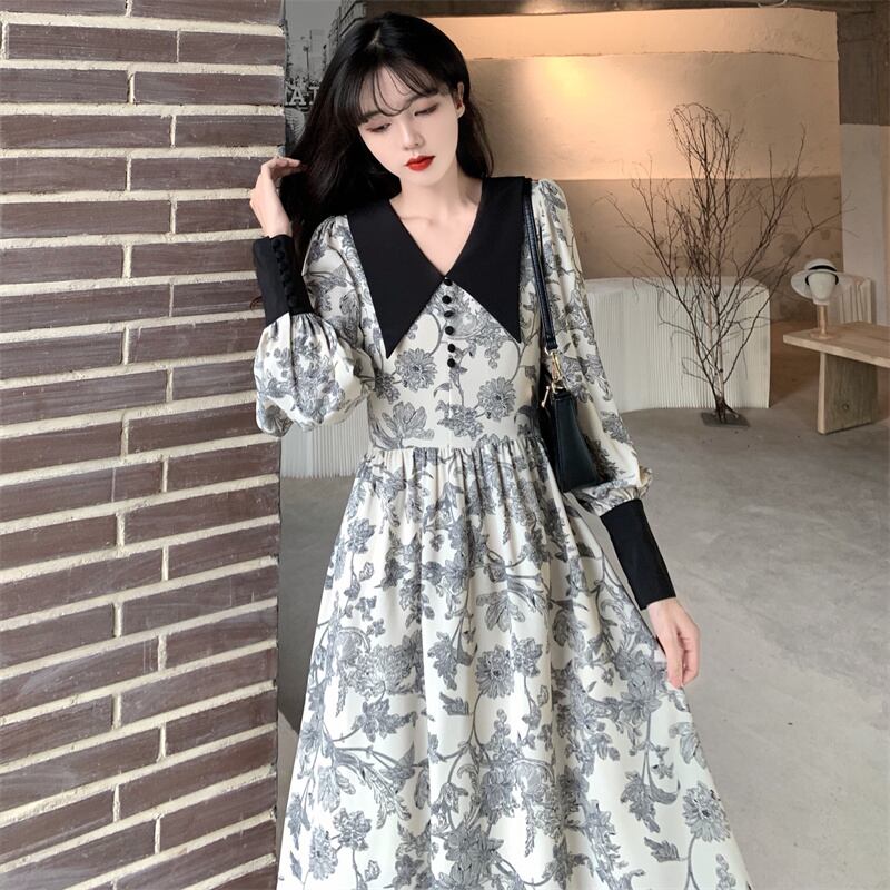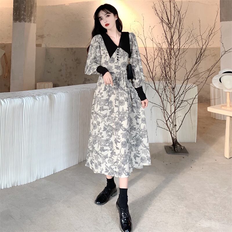 モノトーン フラワープリント 大きめ襟 ビックカラー ロングカフス ギャザー切替え ワンピース 膝下 ミモレ丈 長袖 パフスリーブ Vネック 襟付き セミフレア Aライン 切り替えデザイン ハイウエスト大人可愛い きれいめ シンプル カジュアル 上品 おしゃれ レトロ こなれ感 ガーリー 存在感 花柄 春 秋 レディース 女の子 学生 通学 デート お出かけ 女子会 休日 韓国系 オルチャン スタイル 楽ちん 体系カバー M L XL 2XL 3XL 4XL 大きいサイズ ゆったり ブラック