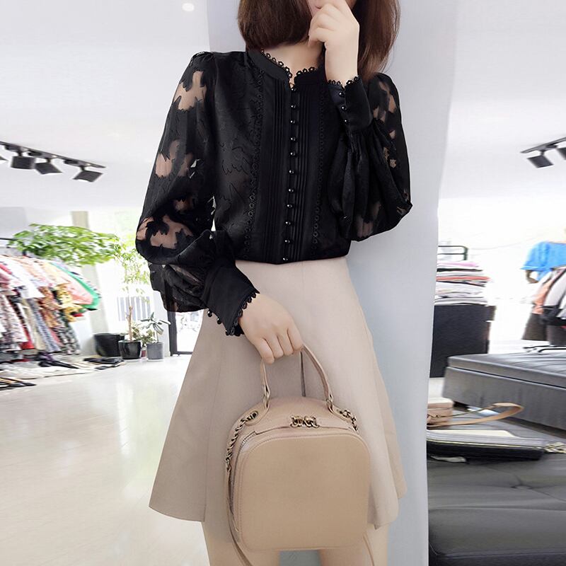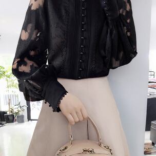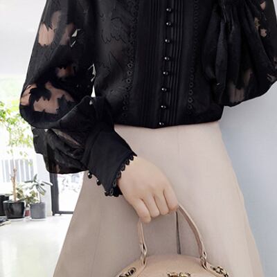 商品名: トップス シャツ ブラウス 長袖 ボリューム袖 ハイネック レース 刺繍 透け感 シースルー