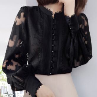 シースルーの透け感と豪華なレース使いが魅力のブラウス。ボリューム袖とハイネックデザインで、トレンドのディテールをしっかりと押さえた一枚です。