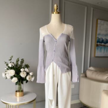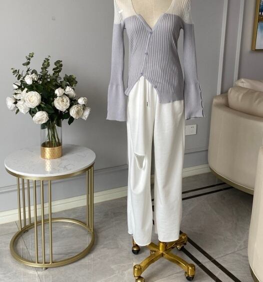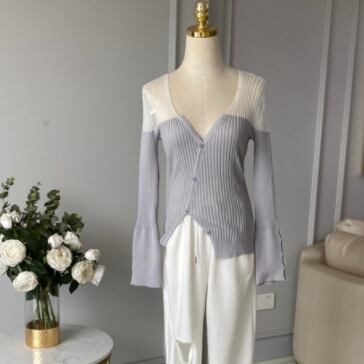 このリブニットトップスは、アシンメトリーデザインが特徴的。Vネックとタイトなシルエットが、女性らしい印象を与えます。