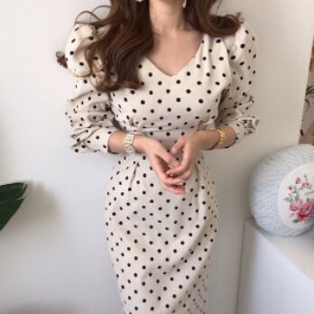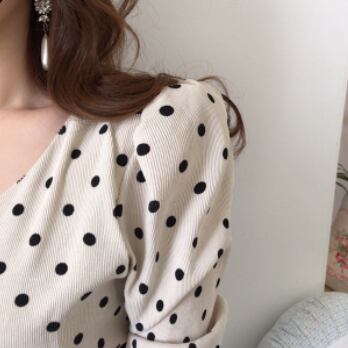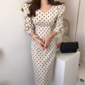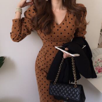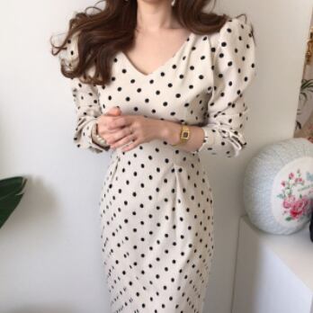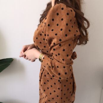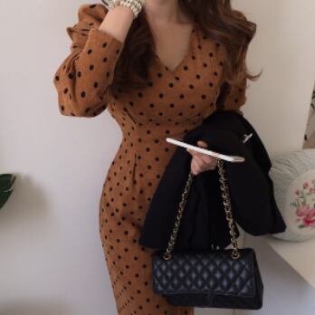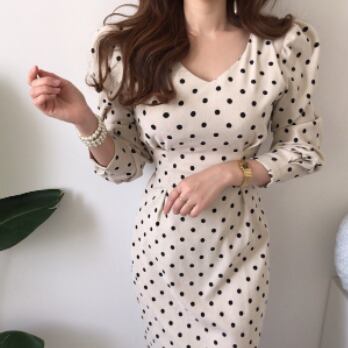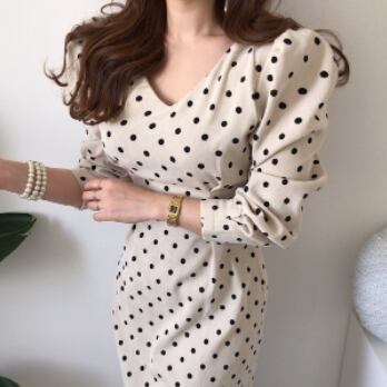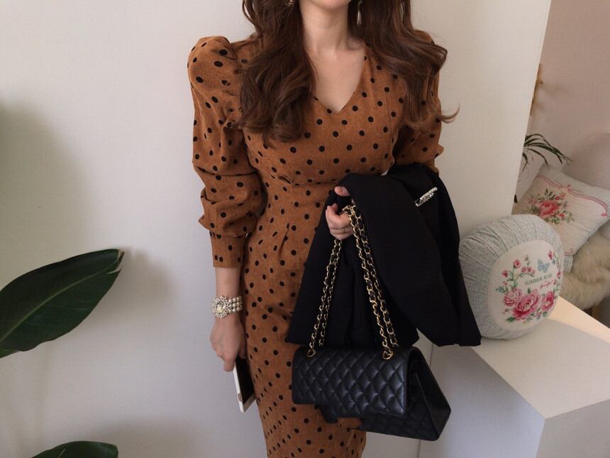 ワンピース 長袖 ボリューム袖 Vネック タイト 細身 スマート コーデュロイ かわいい 大人可愛い きれいめ 大人 上品 おしゃれ お洒落 レトロ 大人可愛い 大人女子 キュート ガーリー 個性的 セクシー エレガント 主役級 存在感 フォーマル 柄 ドット柄 水玉 春 秋 結婚式 二次会 披露宴 10代 20代 30代 40代 レディース 女性用 ママ 女の子 デート お出かけ 女子会 お泊まり 休日 パーティー イベント 着回し 韓国 韓国系 ファッション コーデ スタイル モテ 美脚 インポート
