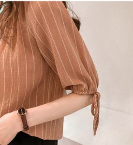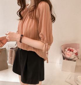 リボンがついた襟なしデザインで、上品な抜け感を演出。透け感のある薄手のシフォン素材は、軽やかで風を通すので夏にピッタリです。ストライプの柄は、クールな印象を与えながらも、かわいくて大人可愛いムードも醸し出します。