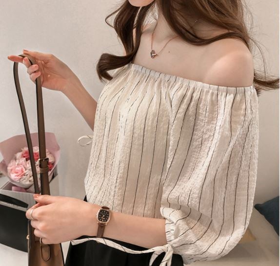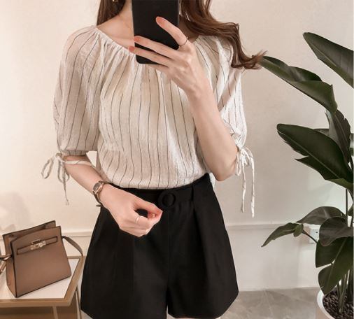 ストライプシフォンシャツ トップス シャツ ブラウス ミディアム丈 ミドル丈 袖あり 半袖 ブッファンスリーブ ラウンドネック オフショル 襟なし ストレート シフォン リボン 薄手 かわいい 大人可愛い きれいめ 大人 上品 おしゃれ 大人女子 こなれ感 クール モード系 エレガント 抜け感 ストライプ 夏 10代 20代 30代 レディース 女性用 オフィス OL 通勤 学生 通学 デート お出かけ 女子会 休日 パーティー リゾート 旅行 ホテル レストラン 着回し 普段使い ファッション コーデ