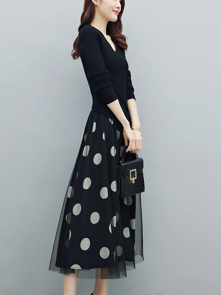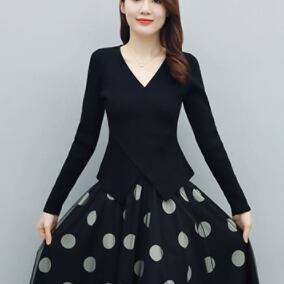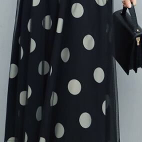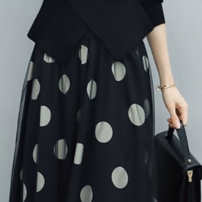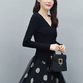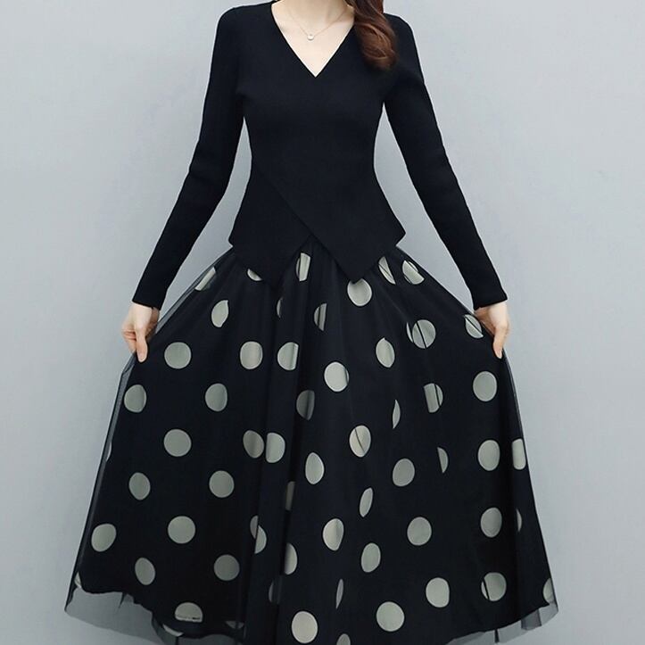 ニットソーに長袖でVネックのトップスと、ロング丈のフレアスカートがセットになった、機能性とおしゃれさを兼ね備えた優れものです。長袖トップスは細身のタイトシルエットで、ボトムスを選ばず、様々なファッションに対応できます。スカートは、細かいドット柄が入った水玉柄と、シンプルな無地の2色をご用意いたしました。スマート感のあるロング丈で、大人っぽく上品な印象を与えます。また、フレアシルエットで女性らしいシルエットを演出してくれます。