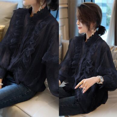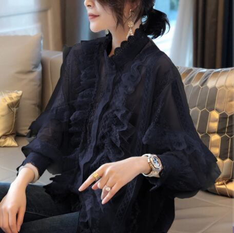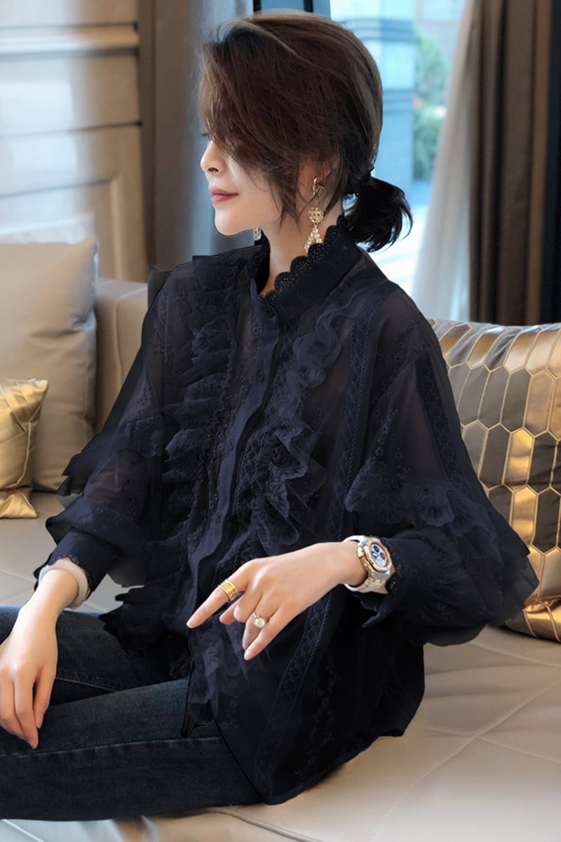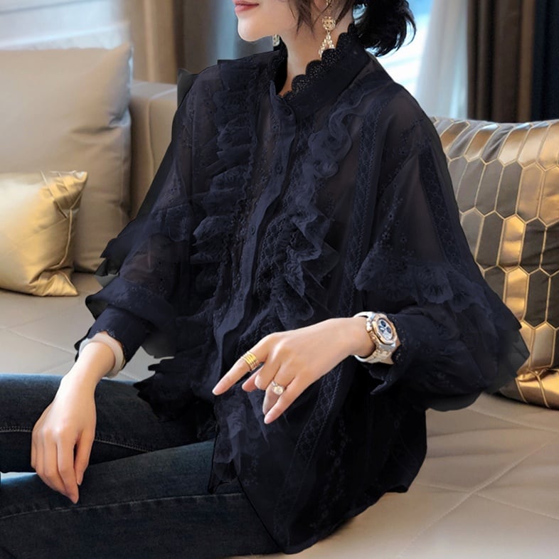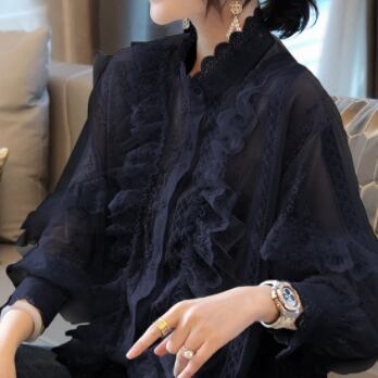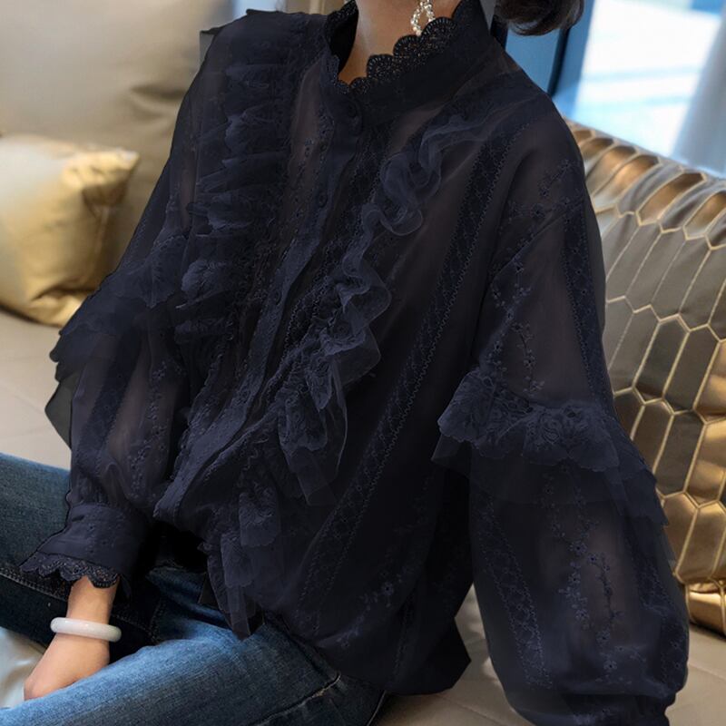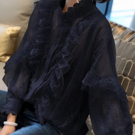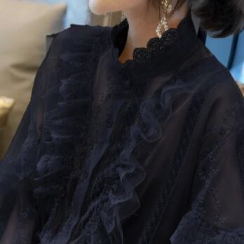 柔らかいレースと繊細な刺繍が魅力のフリルブラウス。高見えするハイネックデザインで、首元がすっきり見えます。袖口や首元、そしてフロントにあしらわれたフリルが、女性らしいやわらかな印象を与えてくれます。