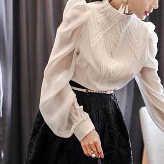 このシフォンシャツは、クラシックなスタンドカラーにランタンスリーブがエレガントなデザイン。上品でありながら、個性的な存在感があります。一見シンプルな無地のシャツでも、袖やディテールに遊びがあるので、コーディネートの主役にもなります。