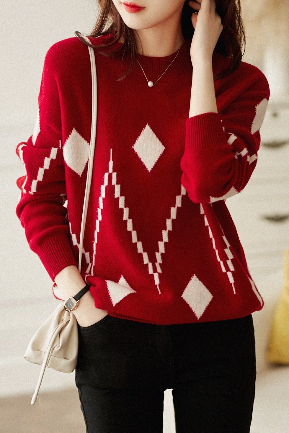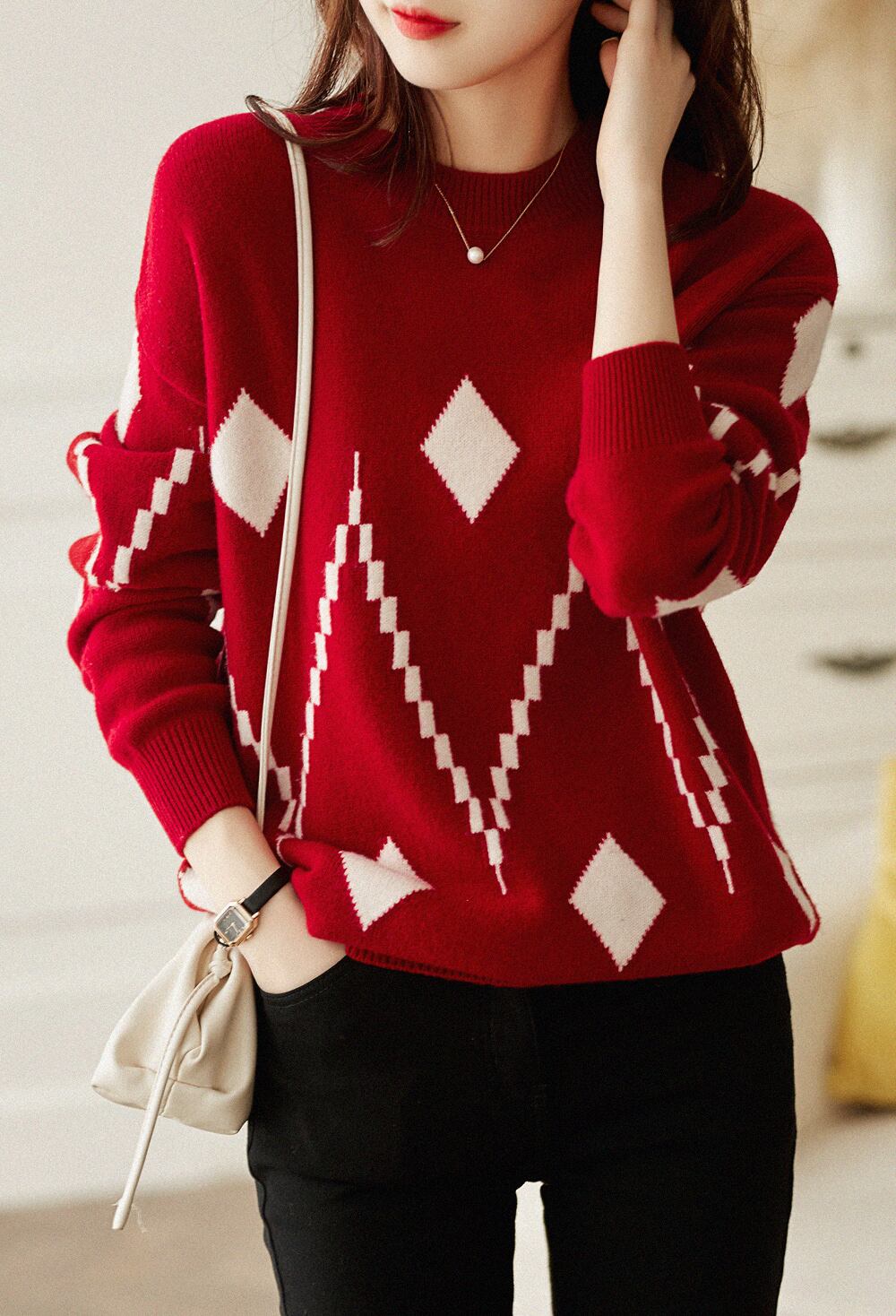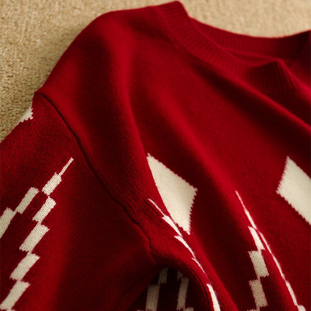 ラウンドネックセーター トップス ニット カジュアル ブラック 黒 ホワイト 白 レッド 赤 レギュラー丈 袖あり 長袖 ラウンドネック ストレート 大人女子 大人 上品 おしゃれ きれいめ シンプル デイリーウェア レトロ レトロ風 こなれ感 個性的 デザイン 主役級 存在感 柄 ひし形 秋 オータム 冬 ウインター 20代 30代 40代 レディース 女性用 オフィス ビジネス OL 通勤 着回し 普段使い ファッション コーデ S M L XL