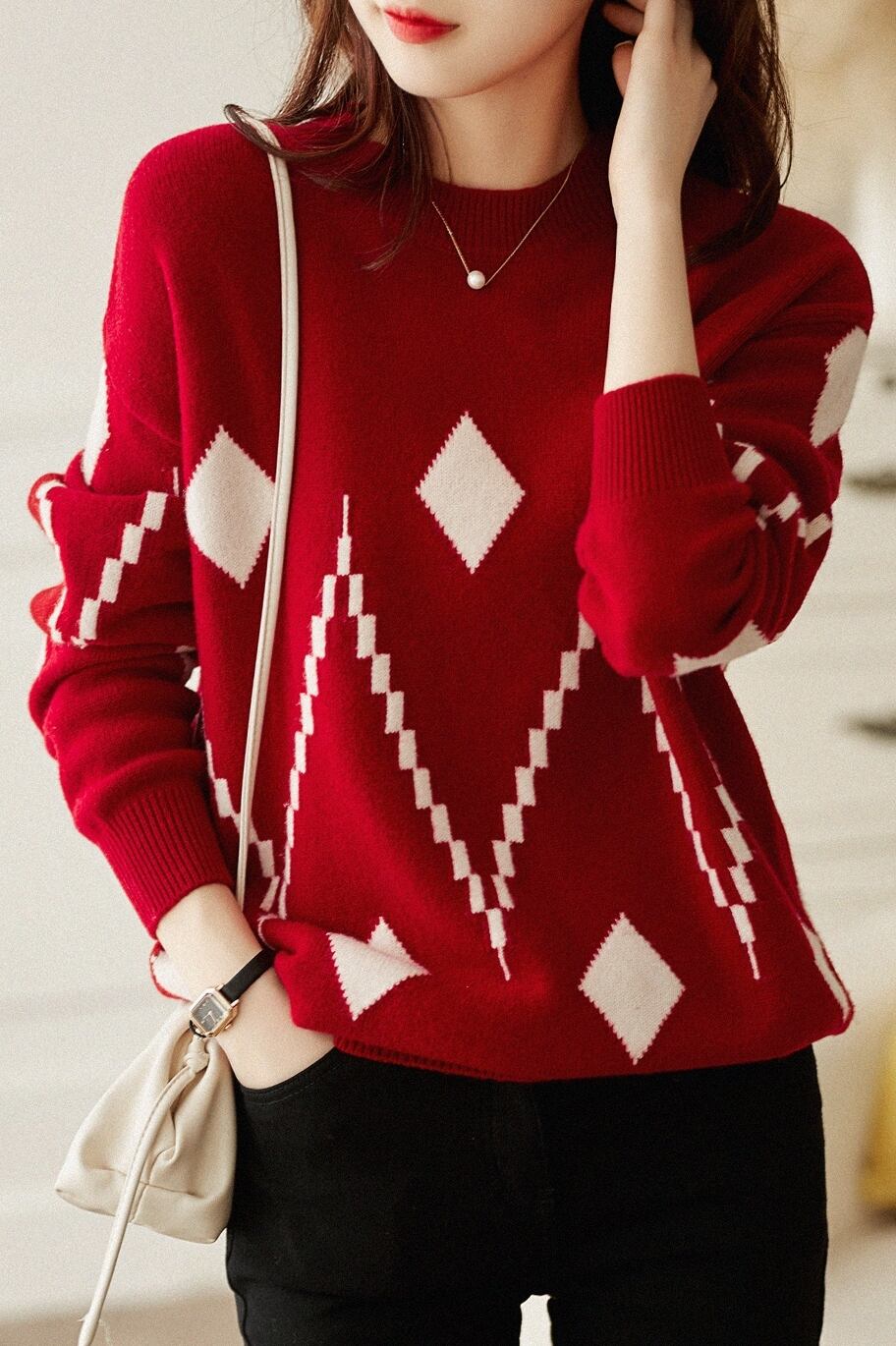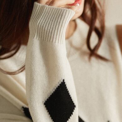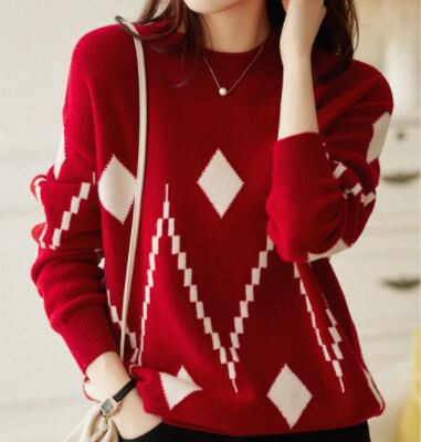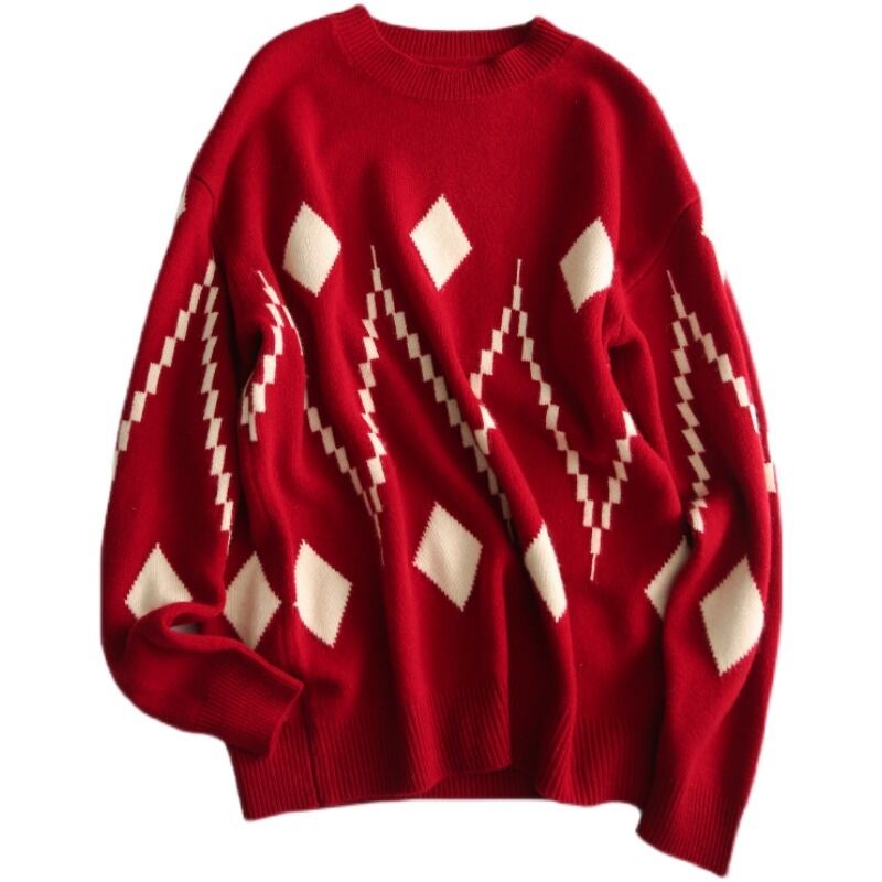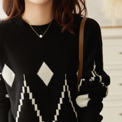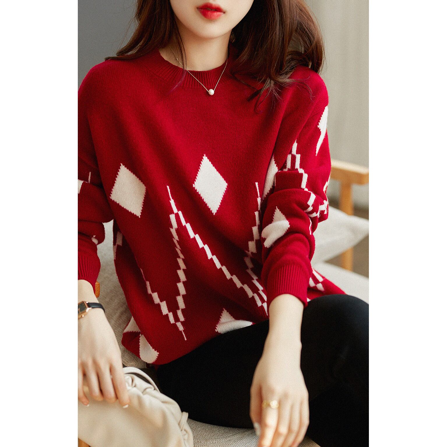 ラウンドネックセーター トップス ニット カジュアル ブラック 黒 ホワイト 白 レッド 赤 レギュラー丈 袖あり 長袖 ラウンドネック ストレート 大人女子 大人 上品 おしゃれ きれいめ シンプル デイリーウェア レトロ レトロ風 こなれ感 個性的 デザイン 主役級 存在感 柄 ひし形 秋 オータム 冬 ウインター 20代 30代 40代 レディース 女性用 オフィス ビジネス OL 通勤 着回し 普段使い ファッション コーデ S M L XL