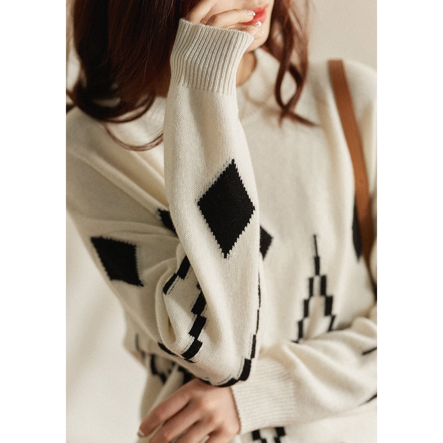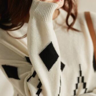 スクエア模様が目を引くラウンドネックセーター
