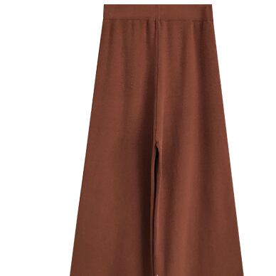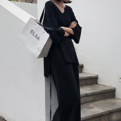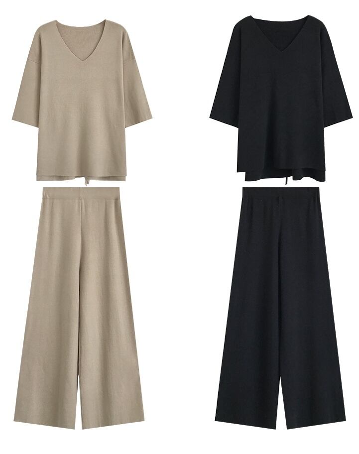 トップスは、袖口に向かって広がるVネックデザイン。襟元が深めのため、デコルテラインが美しく見えます。パンツはウエストゴムで、フワッと広がるワイドパンツ。大人っぽくて、それでいて楽ちん。