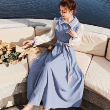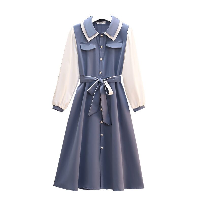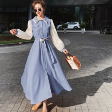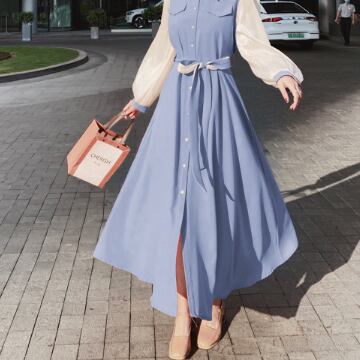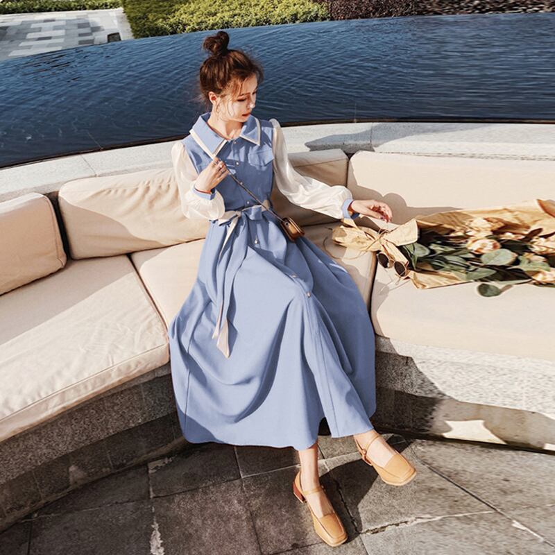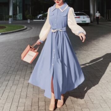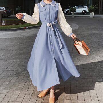 シャツワンピース ワンピース 長袖 襟付き フレア バイカラー かわいい 大人可愛い おしゃれ お洒落 レトロ 大人可愛い 大人女子 ラブリー キュート ガーリー エレガント 主役級 存在感 春 10代 20代 30代 レディース 女性用 ママ 女の子 着回し 普段使い 韓国 韓国系 ファッション コーデ スタイル 楽ちん モテ 体系カバー 美脚 脚長 新作 定番 送料無料 トレンド 流行 インスタ映え インポート 海外 人気 大人カジュアル デートコーデ マリンコーデ ブルー 切り替えデザイン コスパ
