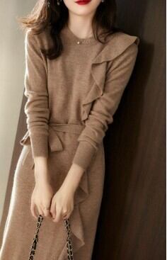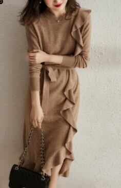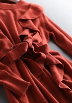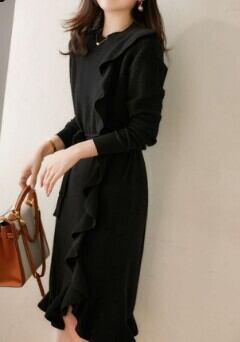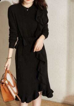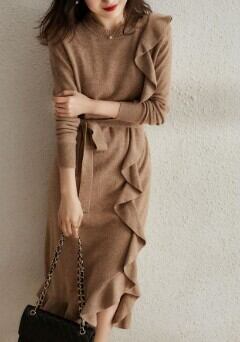 片側のみネック~裾にかけて縦にラッフルフリルをあしらった動きのあるデザインが優美なニットワンピース。