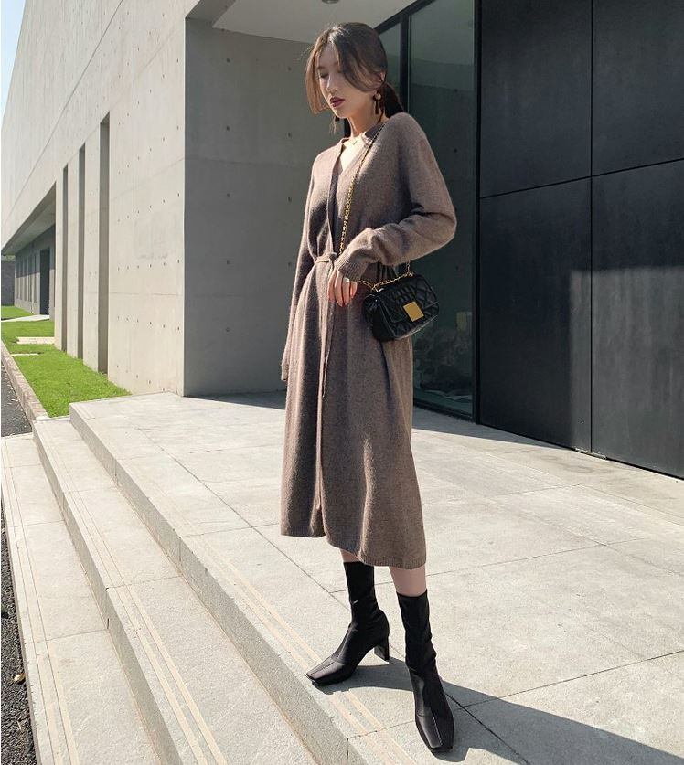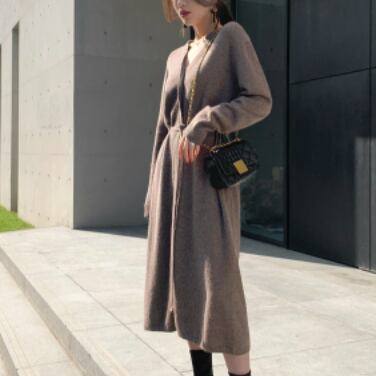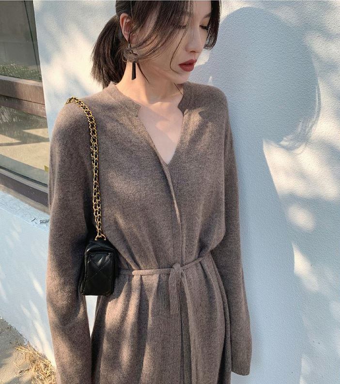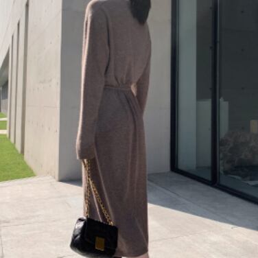 ラウンドネックとVネックを組み合わせたようなキーネックデザインで顔周りをすっきり見せできるニットワンピース。