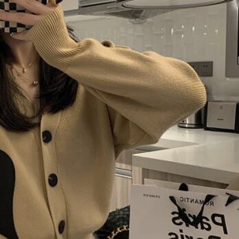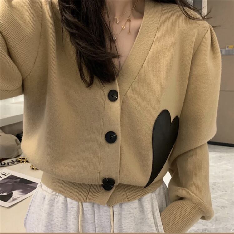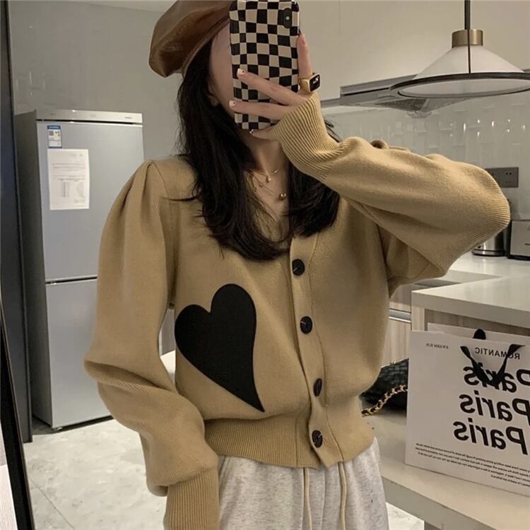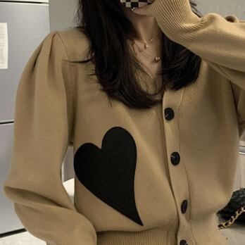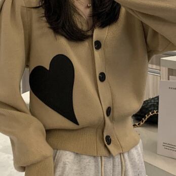 ニットカーディガン トップス セーター スイート ガーリー カーキ ショート丈 袖あり 長袖 Vネック シングルブレスト ボタン アクリル ナイロン 大人女子 大人 上品 おしゃれ デイリーウェア レトロ レトロ風 こなれ感 ルーズ シルエット ラフ キュート かわいい 女子 個性的 デザイン 主役級 存在感 柄 ハート 秋 オータム 20代 10代 レディース 女性用 学生 学校 通学 デート お出かけ 女子会 食事会 着回し 普段使い S M L くすみカラー