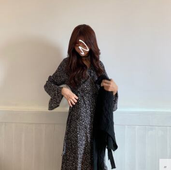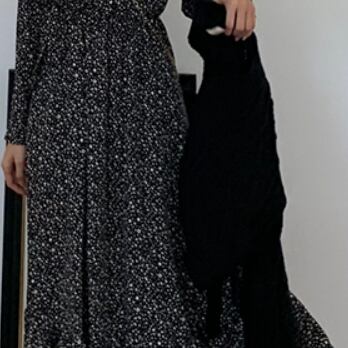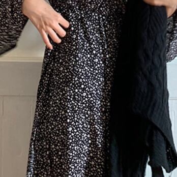 「スイートガーリーなレトロワンピース」。黒の花柄が華やかなふんわりとしたシルエットで、女性らしさを演出します。Vネックと長袖で、大人上品な雰囲気に仕上げました。フレアなAラインで、細身に見せる効果もあります。