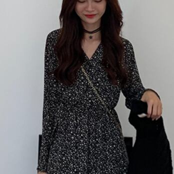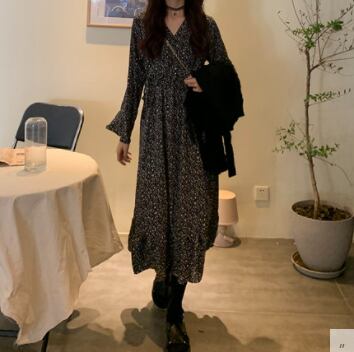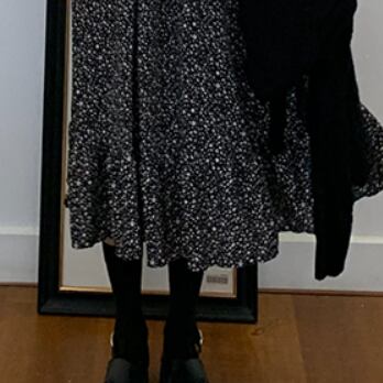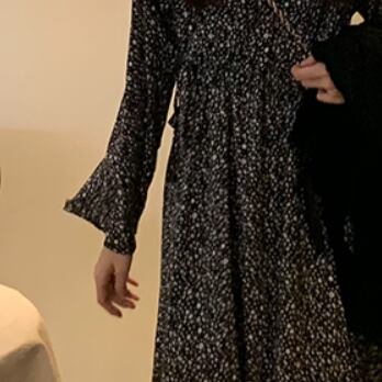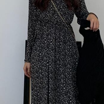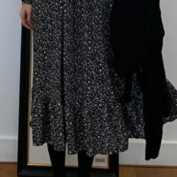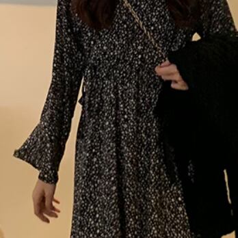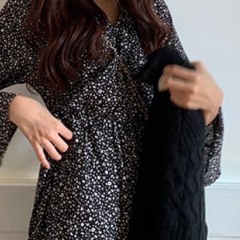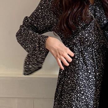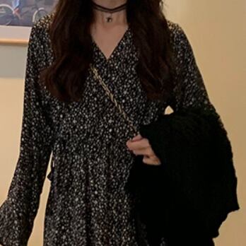 ミドル丈ワンピース スイート ガーリー フェミニン ブラック 黒 ミドル丈 袖あり 長袖 Vネック フレア Aライン スリム 細身 タイト 大人女子 大人 上品 おしゃれ きれいめ シンプル デイリーウェア レトロ レトロ風 こなれ感 キュート かわいい 女子 個性的 デザイン 主役級 存在感 柄 花柄 フラワー 小花柄 春 スプリング 20代 10代 30代 レディース 女性用 学生 学校 通学 着回し 普段使い S M L XL 2XL 大きいサイズ 3XL
