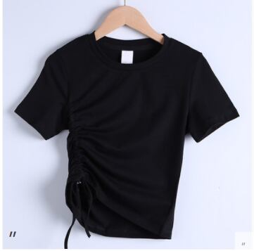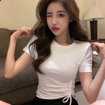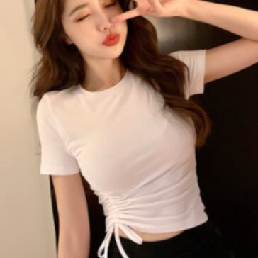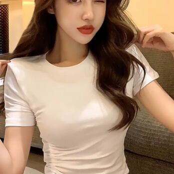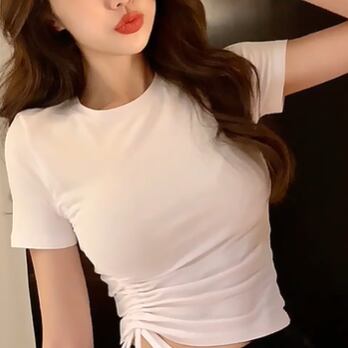 ギャザーTシャツ トップス カジュアル ブラック 黒 ホワイト 白 グリーン 緑 ミニ丈 ショート丈 袖あり 半袖 ラウンドネック スリム 細身 タイト アシンメトリー ギャザー 大人女子 大人 上品 おしゃれ かっこいい クール デイリーウェア レトロ レトロ風 こなれ感 個性的 デザイン 主役級 存在感 無地 夏 サマー 20代 10代 レディース 女性用 学生 学校 通学 デート お出かけ 女子会 食事会 着回し 普段使い S M L XL 2XL