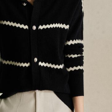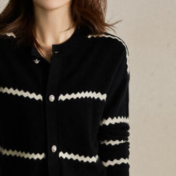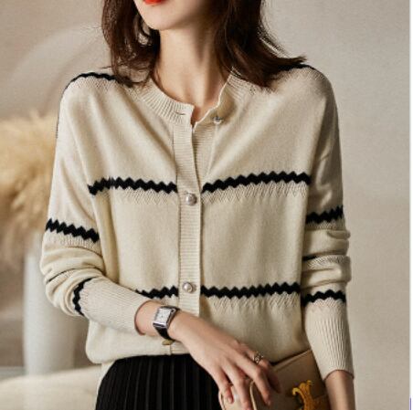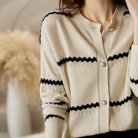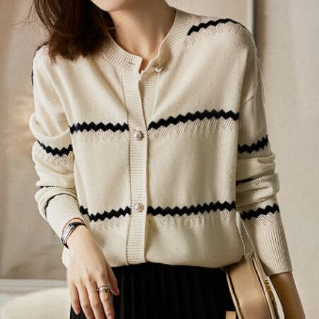 大人女性にぴったりの、色々なシーンで活躍するボーダーニットカーディガン。シンプルで洗練されたデザインが魅力です。