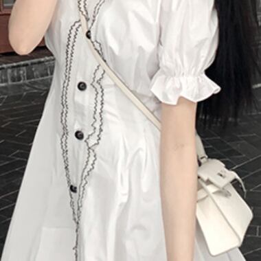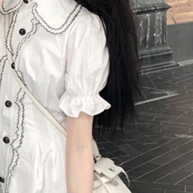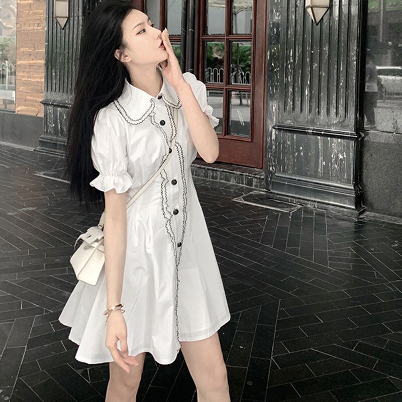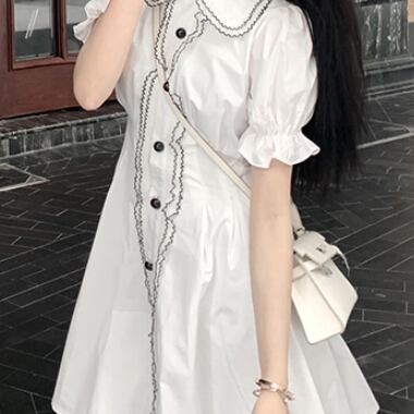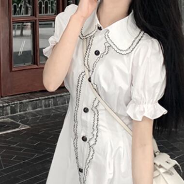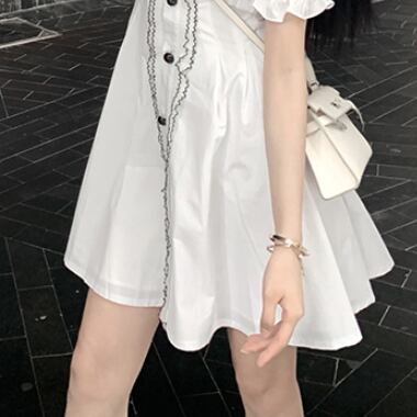 配色トリミング 襟先&前立てプリーツフリル重ね つやボタン ボリュームスリーブ 清楚 フェミニン ワンピース シャツワンピース ミニ丈 膝上 ミディアム丈 半袖 パフスリーブ 襟付き フレア フリル 前開き ポリエステル かわいい 大人可愛い きれいめ シンプル カジュアル おしゃれ お洒落 大人女子 キュート ガーリー 無地 春 夏 レディース 女の子 学生 通学 デート お出かけ 女子会 休日 着回し 普段使い 重ね着 韓国系 オルチャン コーデ スタイル S M L XL ホワイト 白