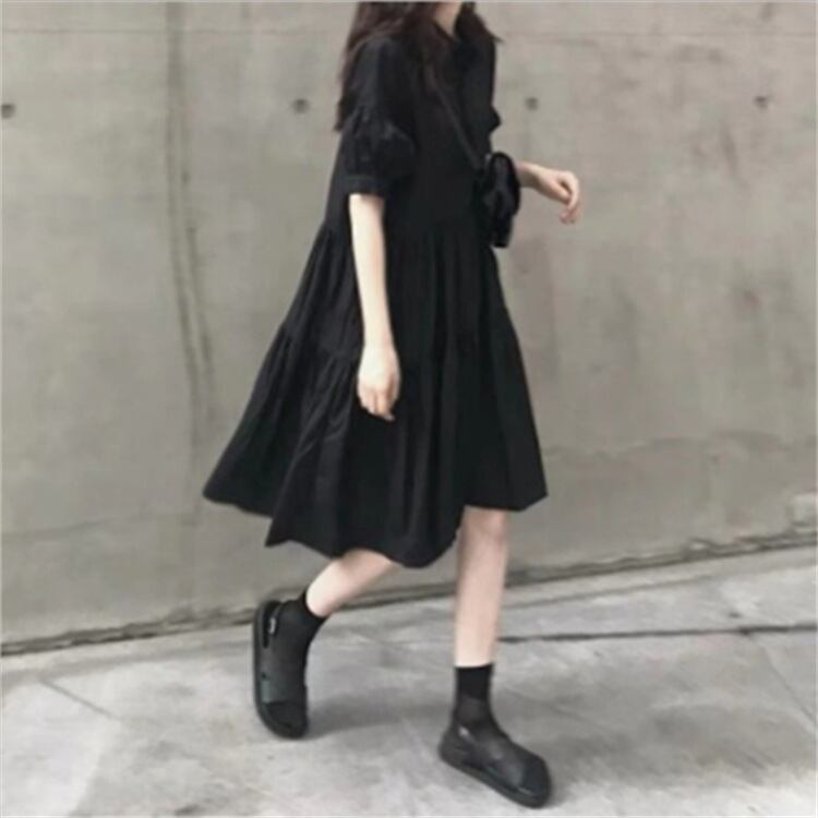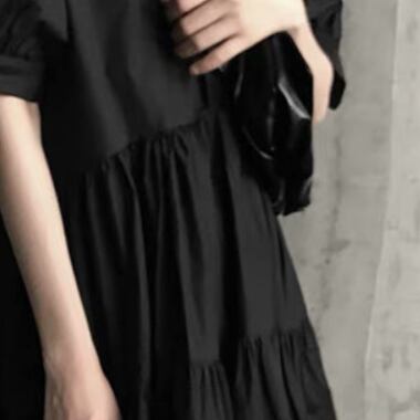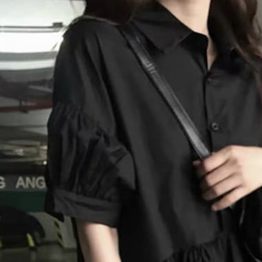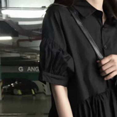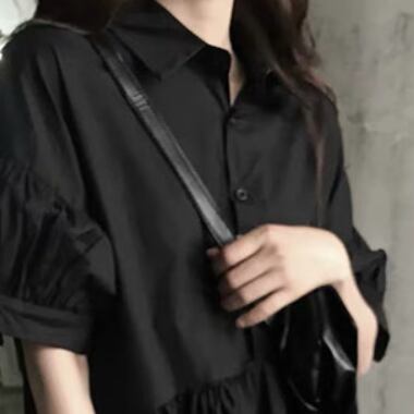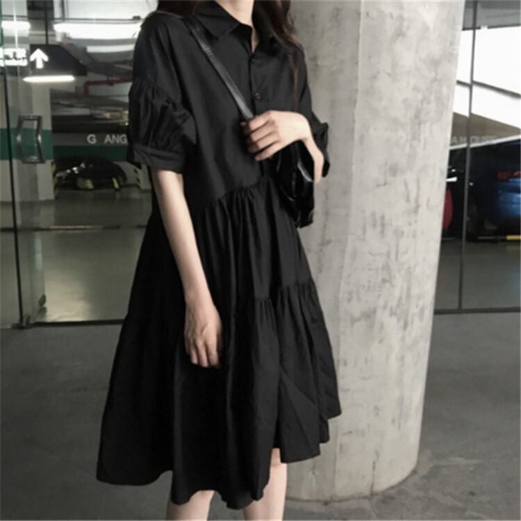 ティアードデザイン ボリュームスリーブ フェミニン ワンピース シャツワンピース ひざ丈 膝上 ミディアム丈 半袖 五分袖 パフスリーブ 襟付き フレア 切り替えデザイン 前開き 綿 かわいい 大人可愛い きれいめ シンプル カジュアル おしゃれ 大人女子 こなれ感 ガーリー モード系 無地 春 夏 秋 レディース 女性用 女の子 学生 通学 デート お出かけ 女子会 休日 着回し 普段使い 重ね着 韓国系 オルチャン コーデ スタイル 体系カバー シック 新作 S M L XL 黒 ブラック