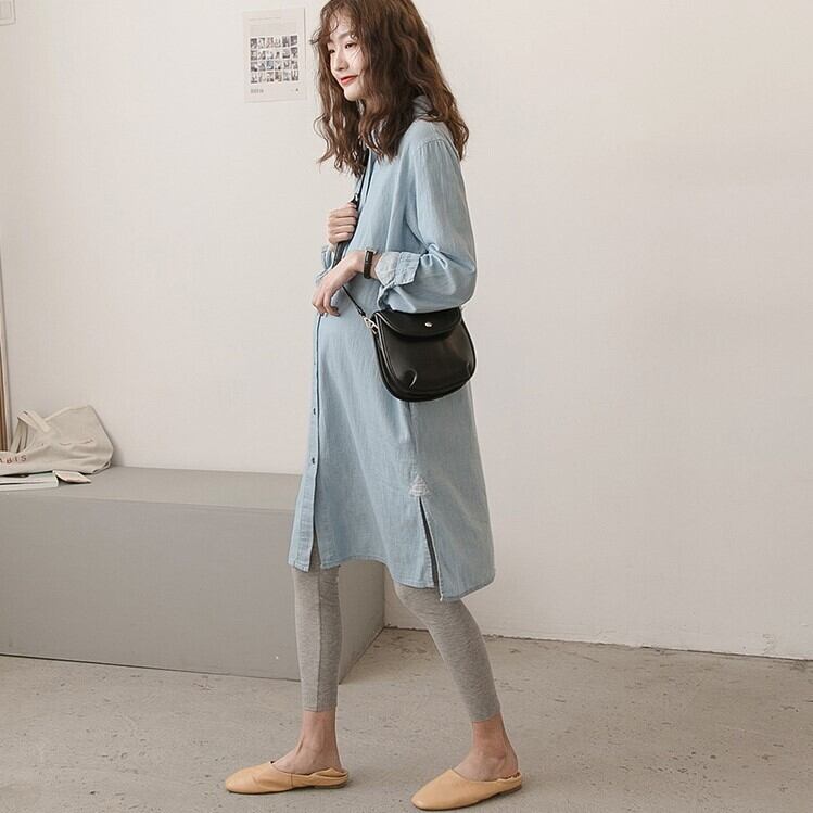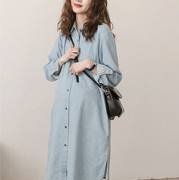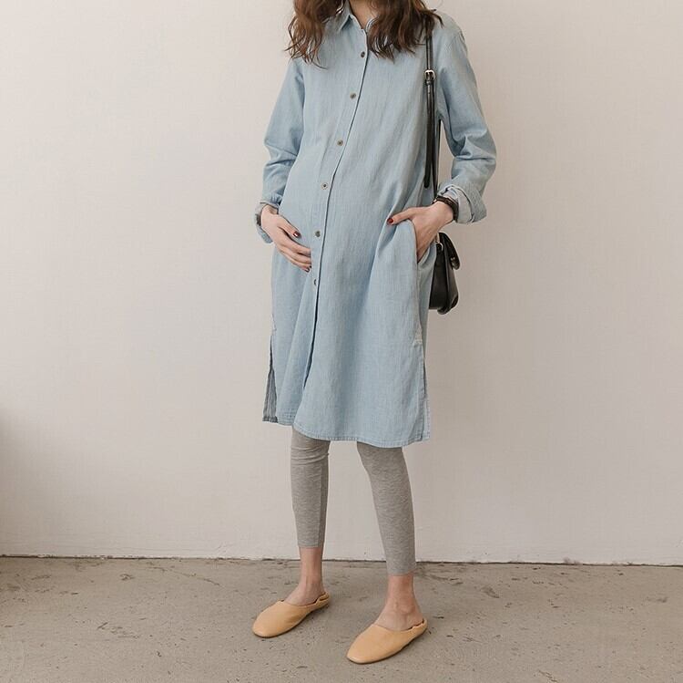 このシャツワンピースは、マタニティでも着られるデザインになっています。お腹周りにゆとりがあるので、お腹が大きくなっても快適に着用できます。