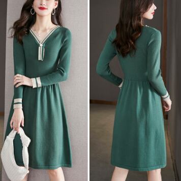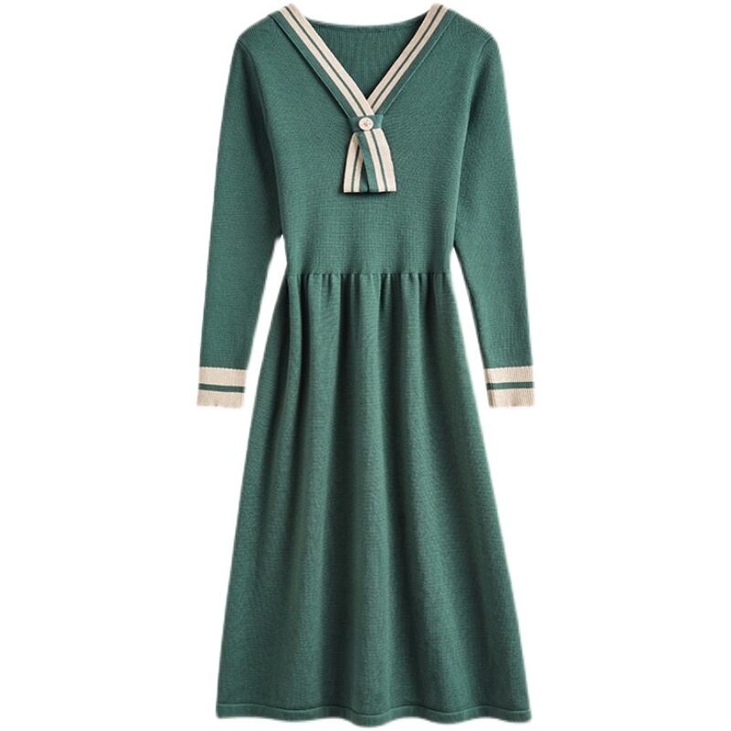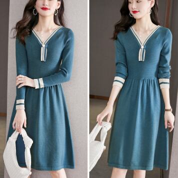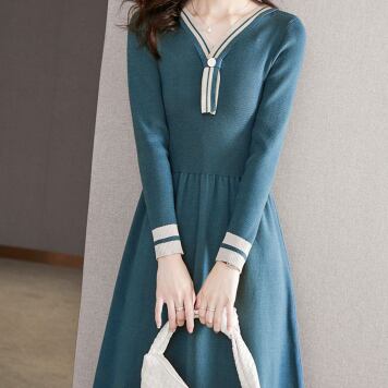 ニットワンピース クラシック シンプル ブラック 黒 ブルー 青 グリーン 緑 ひざ丈 袖あり 長袖 Vネック Aライン ウール 大人女子 大人 上品 おしゃれ きれいめ シンプル エレガント デイリーウェア レトロ レトロ風 こなれ感 個性的 デザイン 主役級 存在感 柄 ライン 春 スプリング 秋 オータム 20代 10代 30代 レディース 女性用 オフィス ビジネス OL 通勤 着回し 普段使い M L XL 大きいサイズ 2XL くすみカラー
