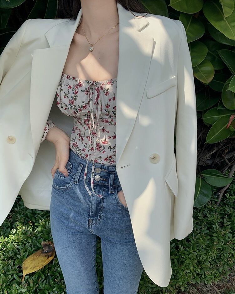 デコルテと背中上部が大胆に開いた前後スクエアネックデザインの花柄ブラウス。