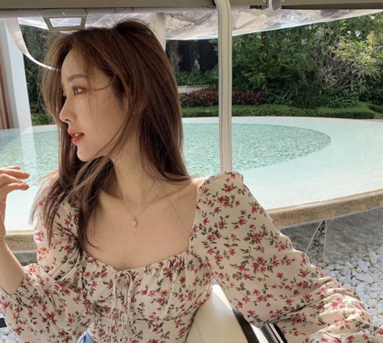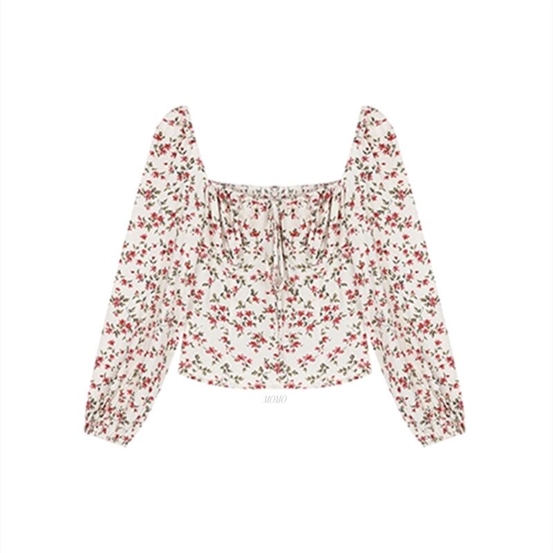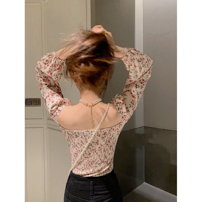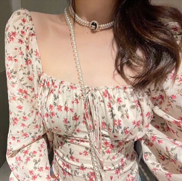 胸元リボン バックシャーリング デコルテ魅せ 胸元開き フラワープリント クロップド トップス ブラウス カットソー ショート丈 袖あり 長袖 パフスリーブ スクエアネック スリム 細身 スマート シフォン リボン 薄手 かわいい 大人可愛い シンプル カジュアル 上品 おしゃれ お洒落 キュート セクシー 抜け感 花柄 春 夏 レディース 女の子 学生 通学 お出かけ 女子会 休日 リゾート 海 普段使い 重ね着 韓国系 オルチャン ファッション コーデ 脚長 S M L 小さいサイズ 赤