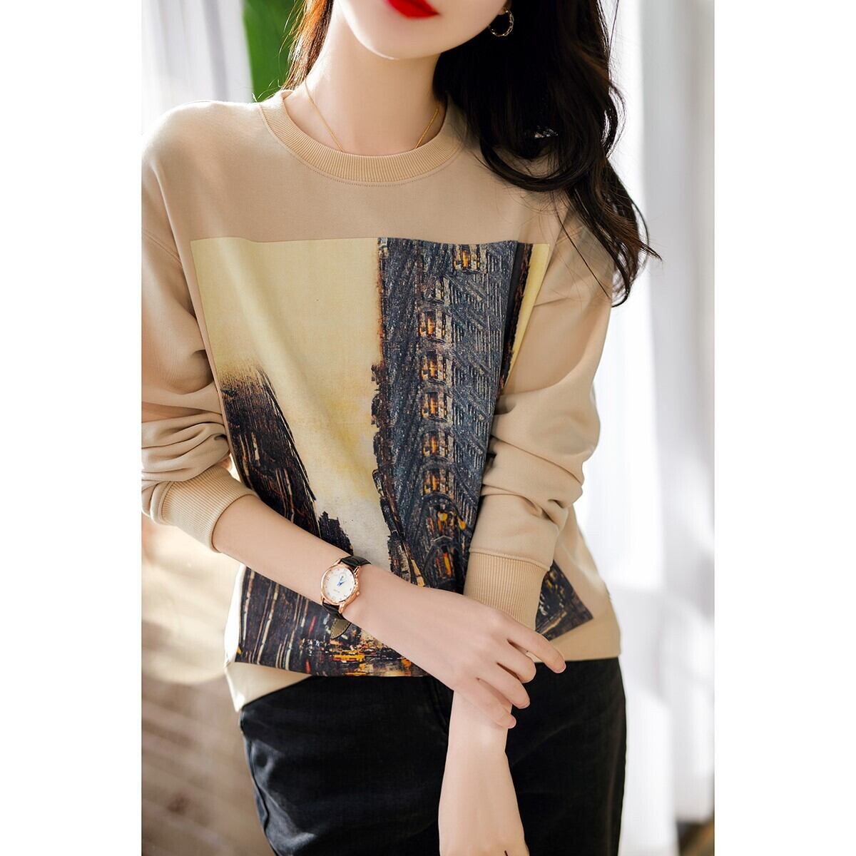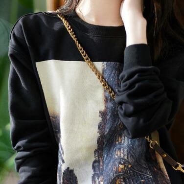 プリントトレーナー トップス セーター カジュアル ブラック 黒 アプリコット レギュラー丈 袖あり 長袖 ラウンドネック ストレート 綿 コットン 大人女子 大人 上品 おしゃれ デイリーウェア レトロ レトロ風 こなれ感 ルーズ シルエット ラフ 個性的 デザイン 主役級 存在感 無地 プリント 秋 オータム 冬 ウインター 20代 10代 30代 レディース 女性用 学生 学校 通学 着回し 普段使い トレンド M L XL 大きいサイズ 2XL 3XL 4XL
