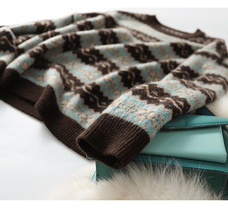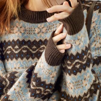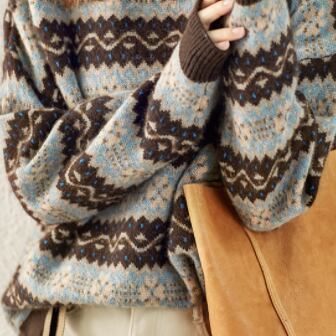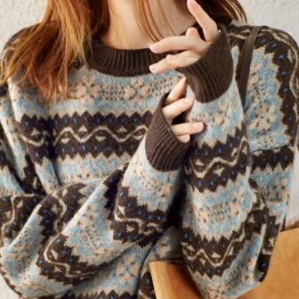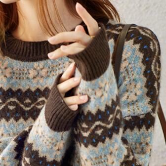 フェアアイル柄ニット トップス セーター 袖あり 長袖 ラウンドネック かわいい 大人可愛い きれいめ シンプル カジュアル 大人 上品 おしゃれ お洒落 レトロ 大人可愛い 大人女子 こなれ感 ラブリー キュート ガーリー 個性的 主役級 存在感 抜け感 柄 秋 冬 10代 20代 30代 レディース 学生 通学 デート お出かけ 公園デビュー 女子会 休日 着回し 普段使い 重ね着 韓国系 オルチャン サイズ S M L XL 2XL 3XL 色展開 茶色 ブラウン
